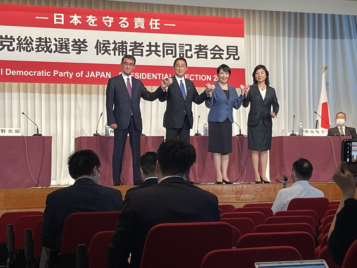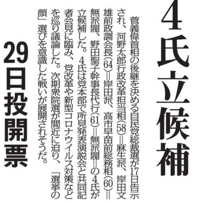 自民党の総裁選の4人候補者が出た記者会見、テレビ番組やネッ番組を全部見たら、内容は全く同じだった。テーマは非常に限られている。