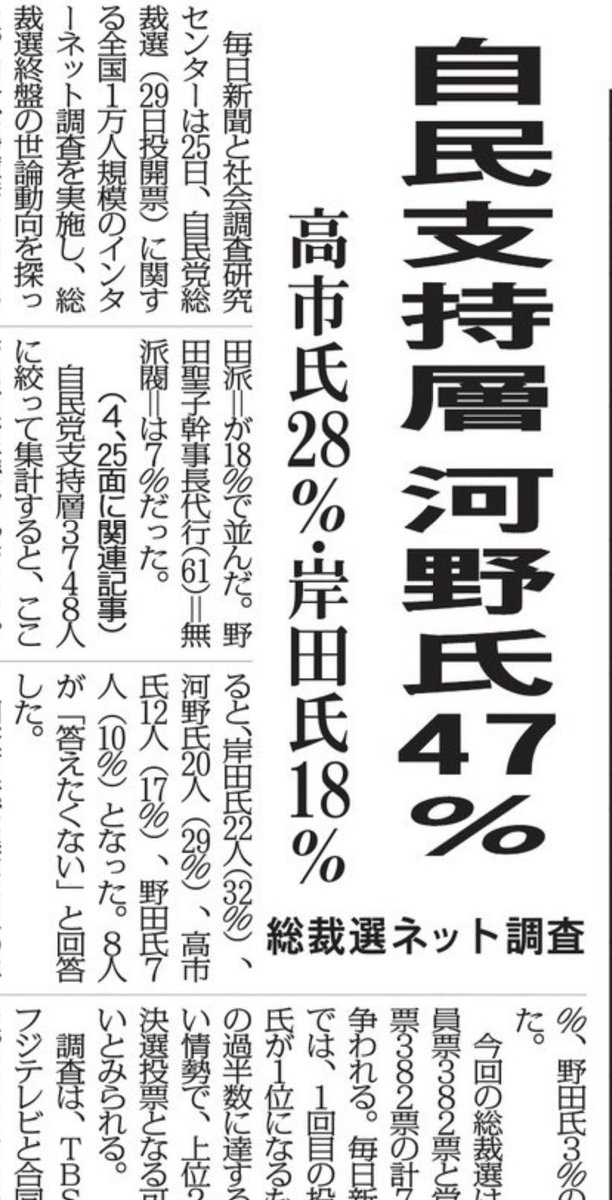 不思議です。実績はともかく、何らかの理由で話題になった人が世論調査で「ふさわしい」になる。マスコミによると世論調査で最も「ふさわしい」と報道された人は話題性が増して世論調査でさらに「ふさわしい」になる。いつも同じプロセスだ。マスコミの責任が重い。 twitter.com/nikkei/status/…