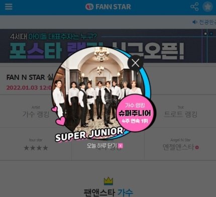 [Naver] Super Junior, ranked first on Fan N Star' singer ranking for 5 weeks in a row.Super Junior took the first place with 29,239,321 votes in the first week of January singer rankings for 'Fan N Star' held from the 3rd to the 10th.