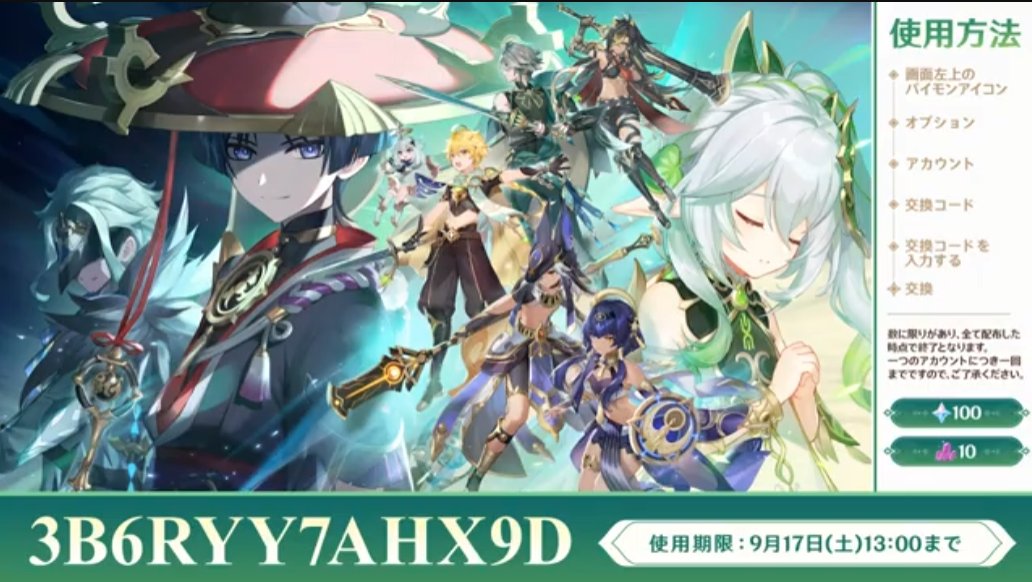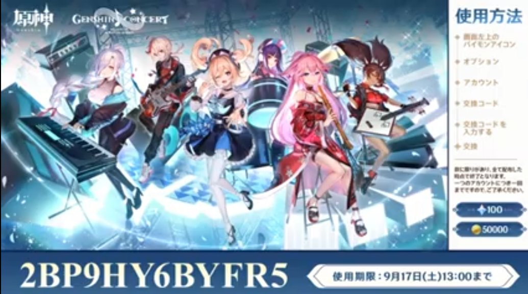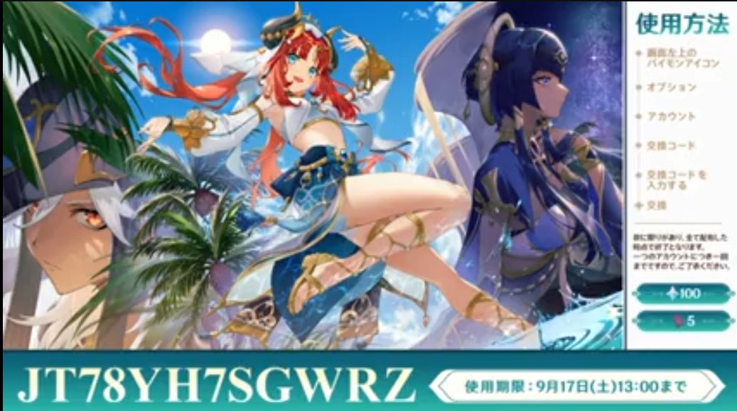 このコードをゲーム内オプションか公式サイトのCODEのページで入力すると原石100と50000モラが貰えます。