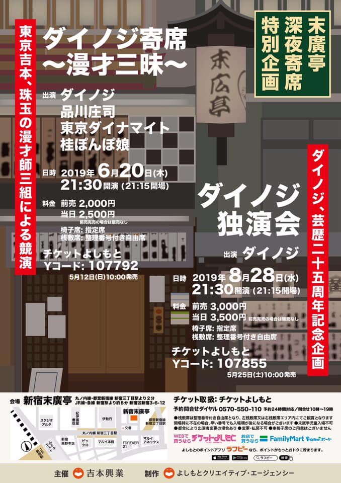 二十歳の時に吉本の門を叩いた。東京NSC一期生。品川と庄司とオレは同期。その半年前に劇場オーディションで入ったダイノジさんはオレの一番近い兄さん。オレは外に出て十五年経って吉本に帰った。三組が6・20新宿末広亭に揃い踏みする。オレにとってちょっと特別な寄席。