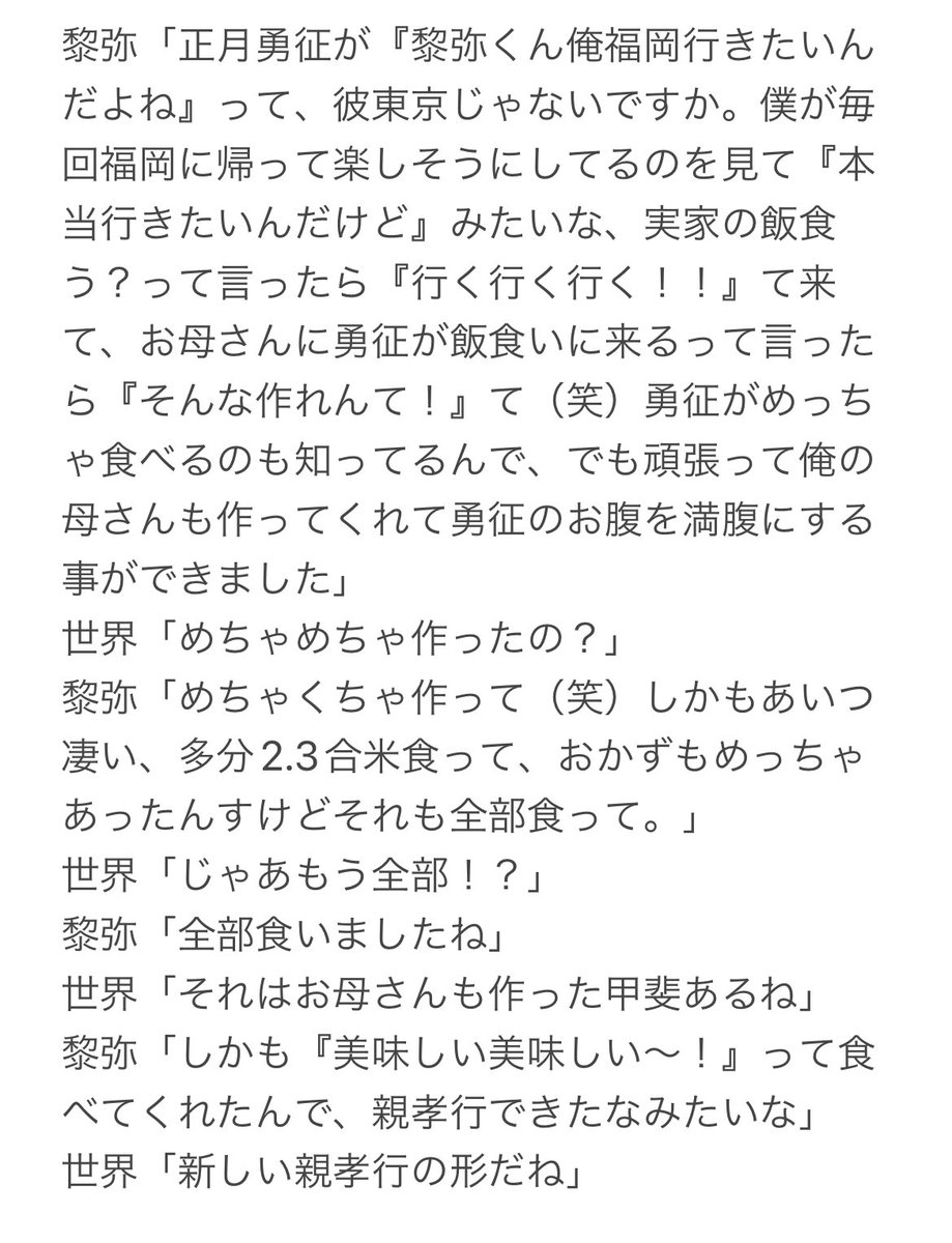 TBTで何回も大きく息を吐いて今にも泣き出しそうだったのにずっと我慢してて、最後の挨拶で「明日は翔太の命日です!皆さんで翔太に想いを届けて明日も最高な日にしましょう」って泣かずに言えた黎弥さんは本当に友達想いの優しい人だった しょたれやはズッ友って言葉が本当に似合う