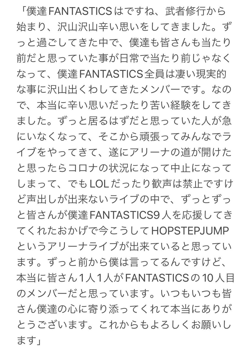 「ファンタは行ける!って思われてるからね。出来るから。ちゃうちゃう、無理してんねん。みんな優しいから言わないのよ。言う人いるけど基本的皆アホだから、いいこちゃんだから、筋の通ったわがままを言わないのよ。俺は言っちゃう 32だから」