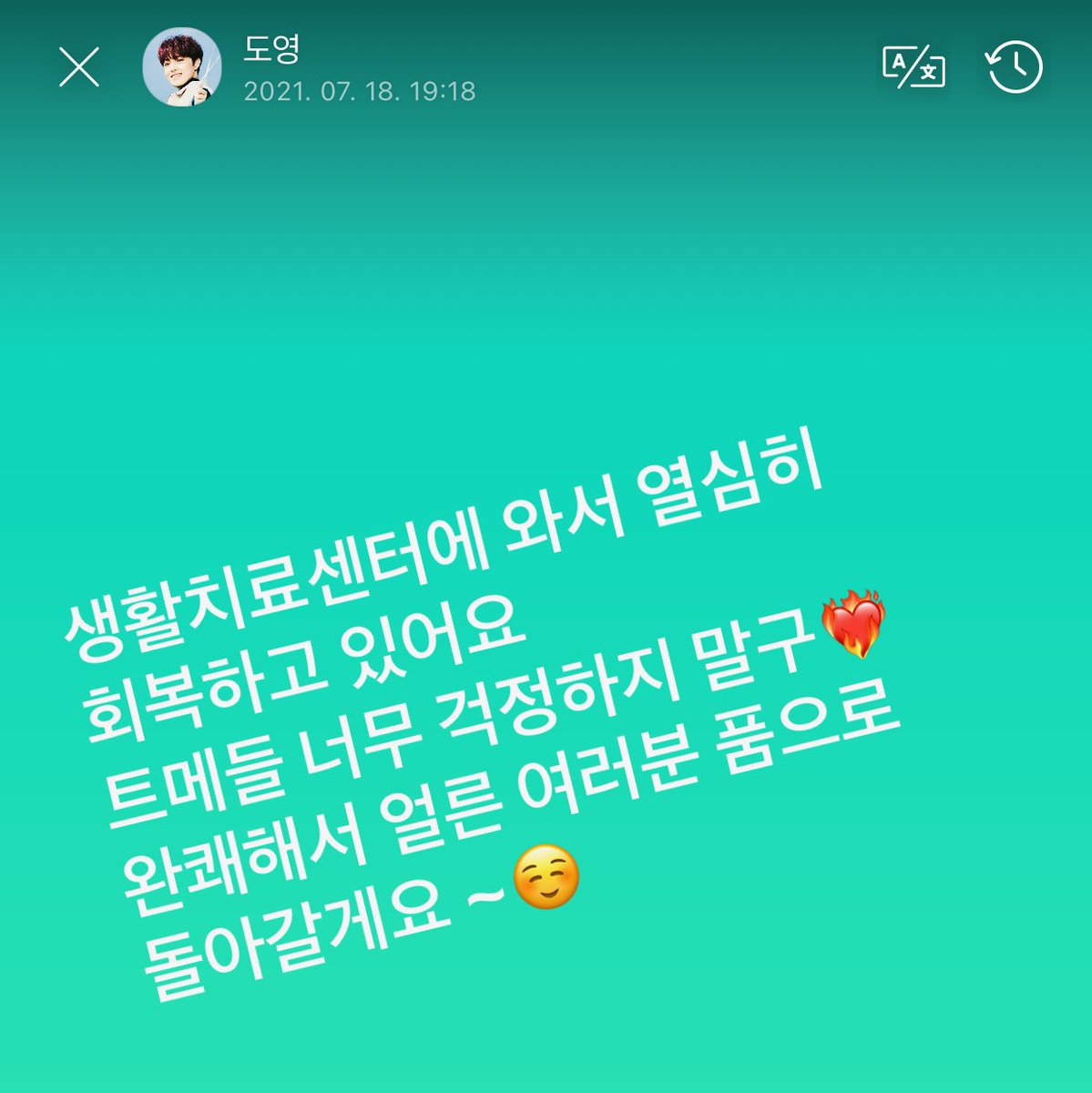 "์ํ์น๋ฃ์ผํฐ์ ์์ ์ด์ฌํ ํ๋ณตํ๊ณ ์์ด์. ํธ๋ฉ๋ค ๋๋ฌด ๊ฑฑ์ ํ์ง ๋ง๊ตฌโค๏ธโ๐ฅ ์์พํด์ ์ผ๋ฅธ ์ฌ๋ฌ๋ถ ํ์ผ๋ก ๋์๊ฐ๊ฒ์~ โบ๏ธ"