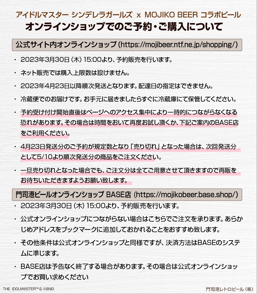 アイドルマスター シンデレラガールズ×MOJIKO BEER、再販のご案内です。