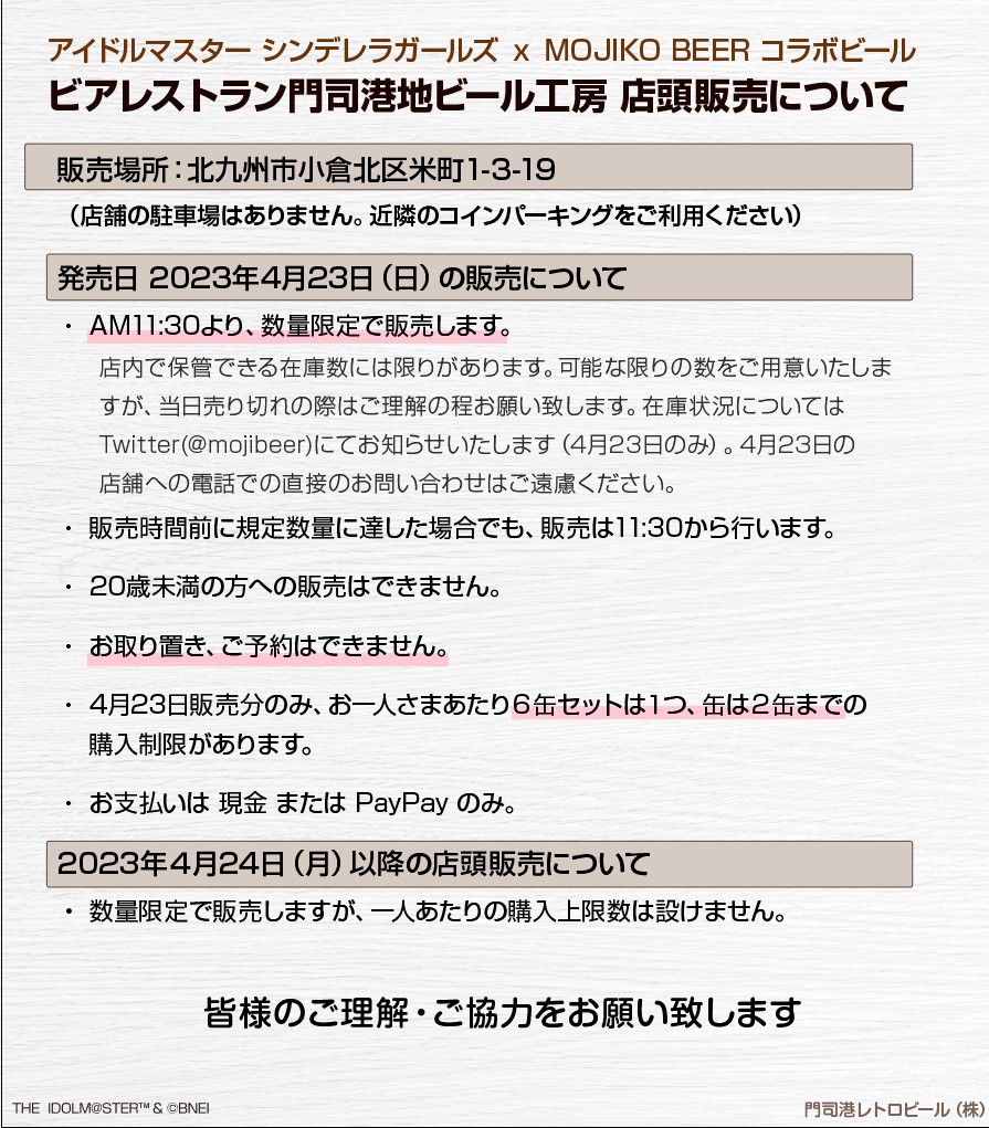 アイドルマスター シンデレラガールズ×MOJIKO BEER、コラボビール店頭販売、無事完売致しました。