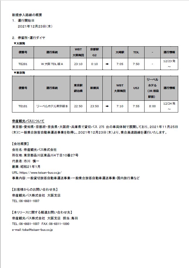この度、当社は新たに一般乗合旅客自動車運送事業の事業許可を取得し、WILLER EXPRESS株式会社様との業務提携により2021年12月23日から東京・横浜⇔京都・大阪の高速乗合バス運行を開始します。詳細につきましては添付をご覧ください。