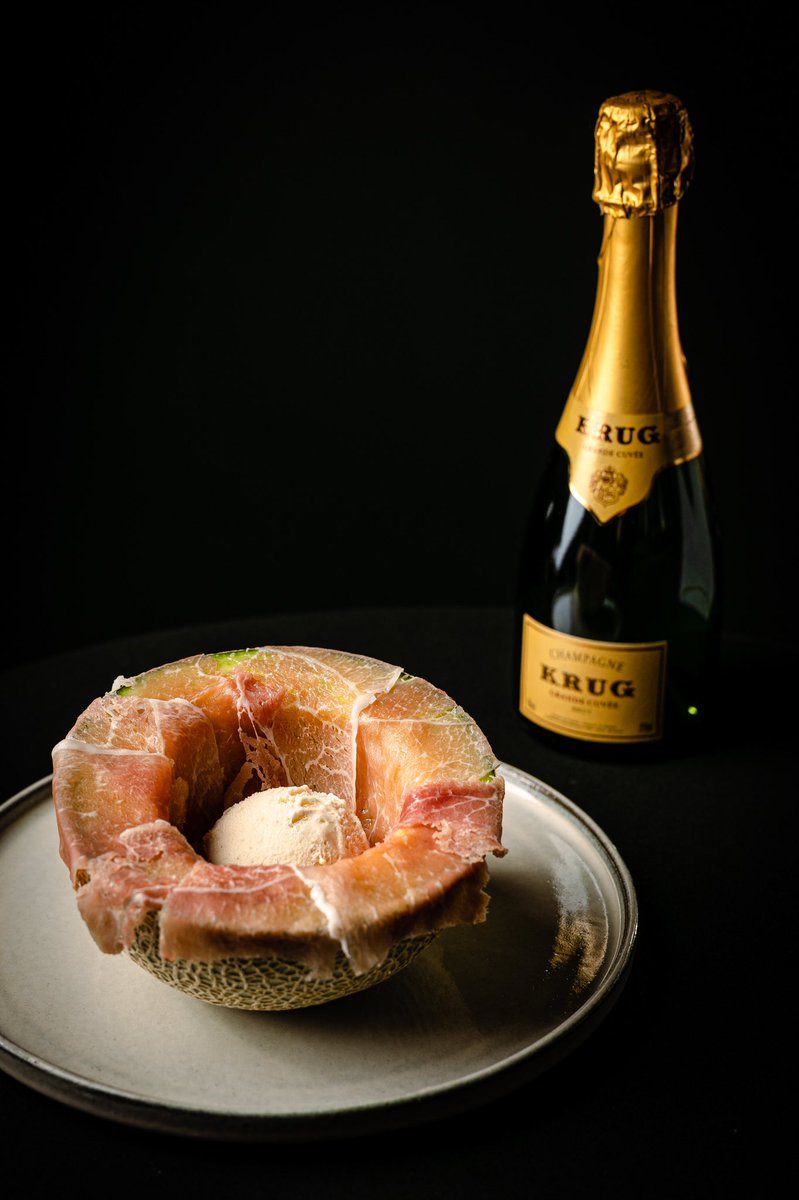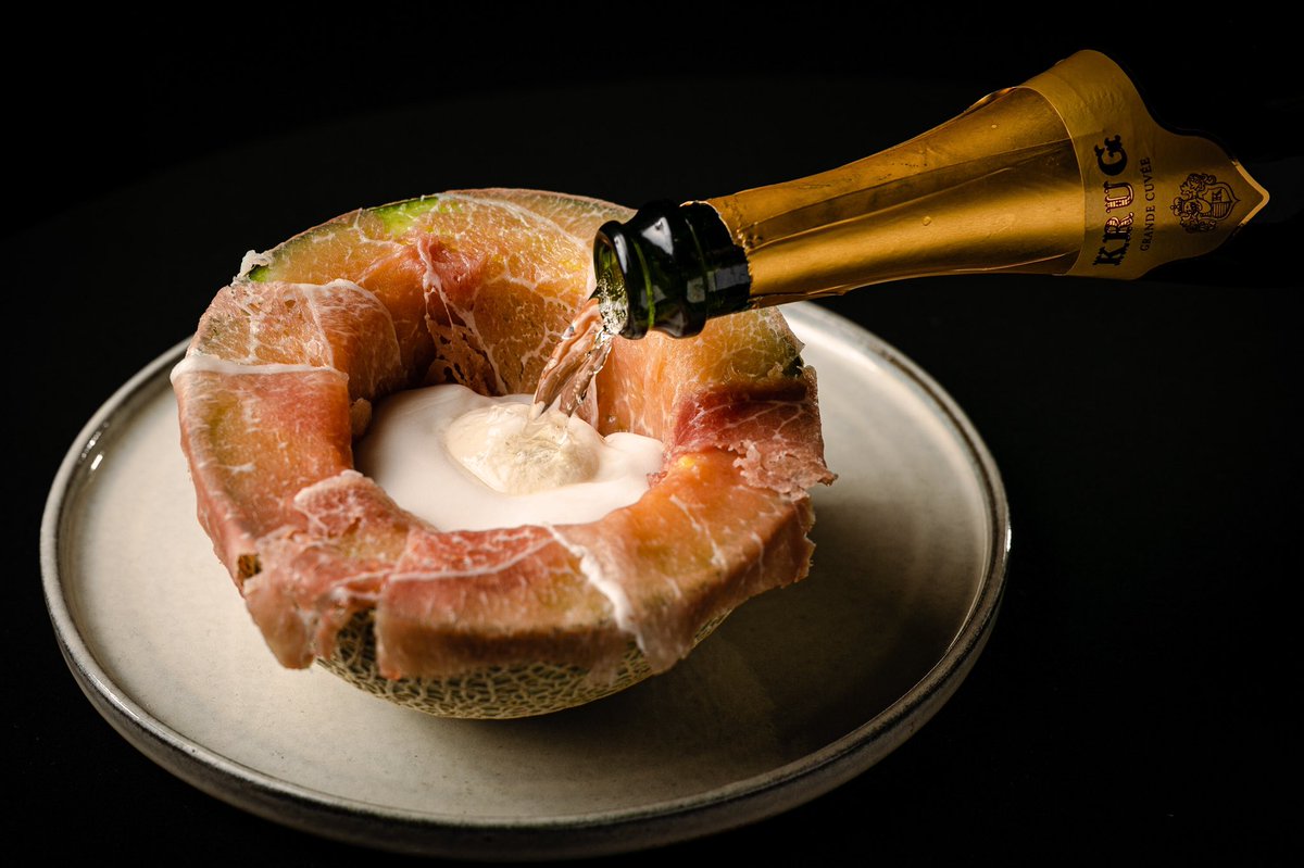 マスクメロンに幻の生ハム「クラテッロ・ディ・ジベッロ」とバニラアイスを添え、仕上げにシャンパンを注ぎ入れます。