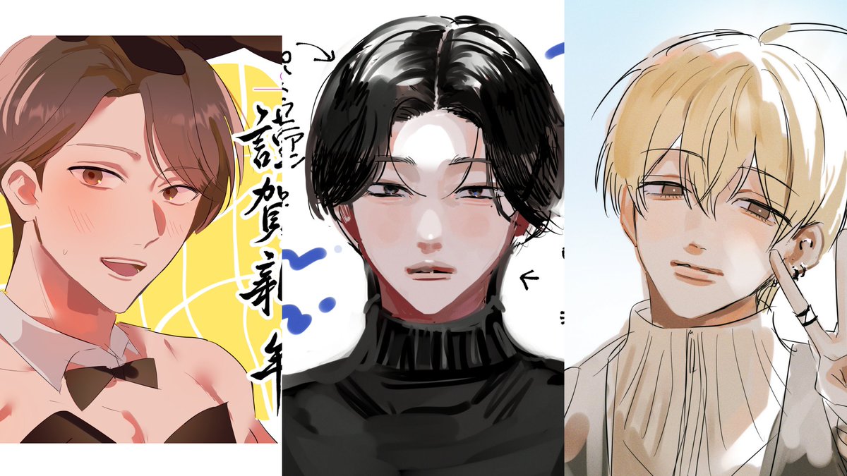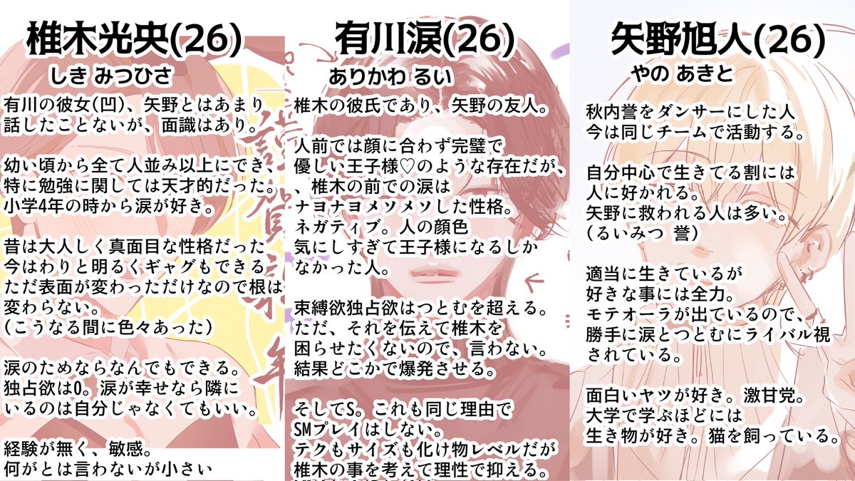 プロフに書いてある るいみつ、今年は描きます✊🏻❤️🔥 あかあきの投稿頻度は落とさないつもりです😼 良ければ激長性格設定見てください〜〜可愛いよ❕ 3人は幼なじみです