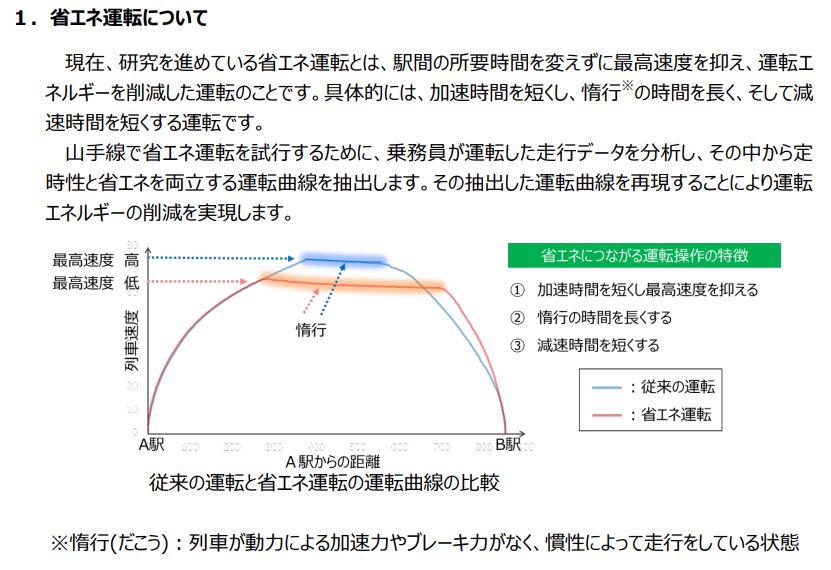 山手線、車両モニタリング装置に蓄積された走行データを分析して駅間ごとの加減速操作のタイミングを決定し乗務員にその通りにしてもらったところ、運転エネルギーを10%も削減できたそうです。