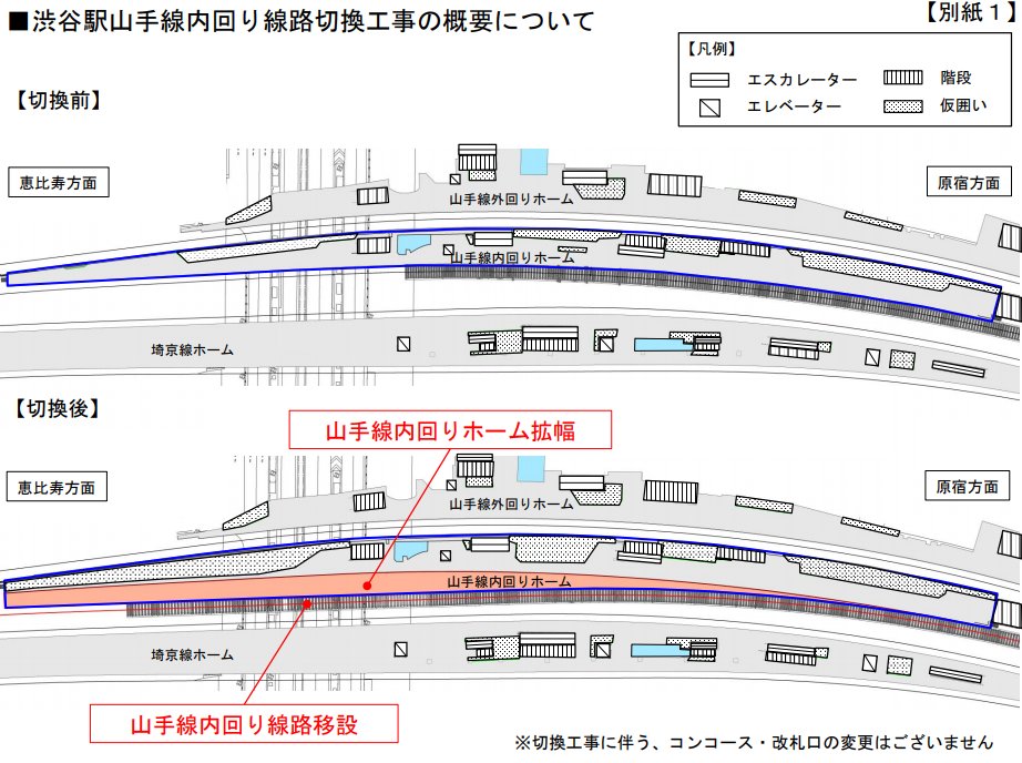 渋谷駅の島式ホーム化を見据えた内回りホームの拡幅に伴うもので、線路切換工事に伴う山手線の運転見合わせとしてはJR東日本発足以来最長とのことです。