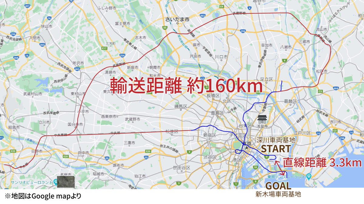 2018年7月に東京メトロ07系がB修工事のため東西線深川車両基地から有楽町線新木場車両基地へ輸送された際の経路です。