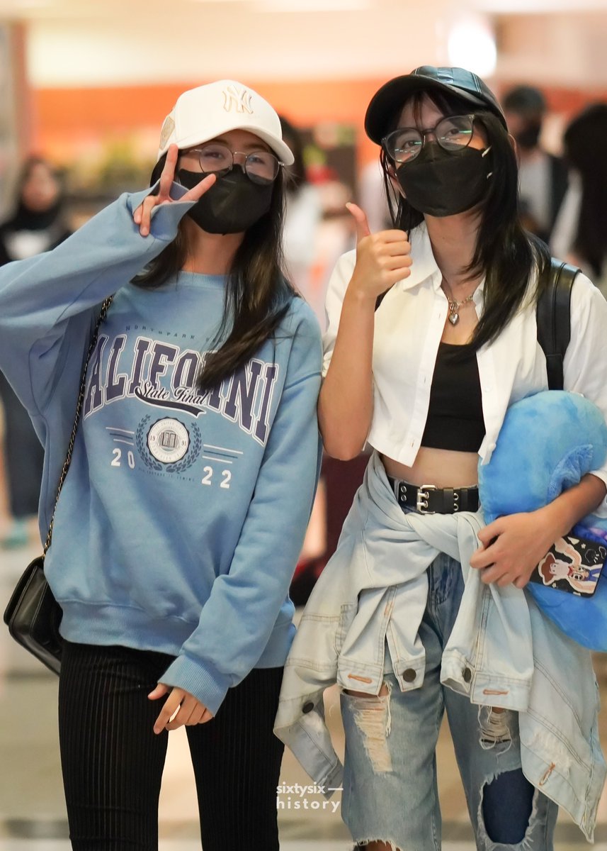 @AW_CallieJKT48 & @PS_AmandaJKT48 at Sultan Hasanuddin Int. Airport Makassar for Bersenang Ria – 030323 #JKT48AirportFashion