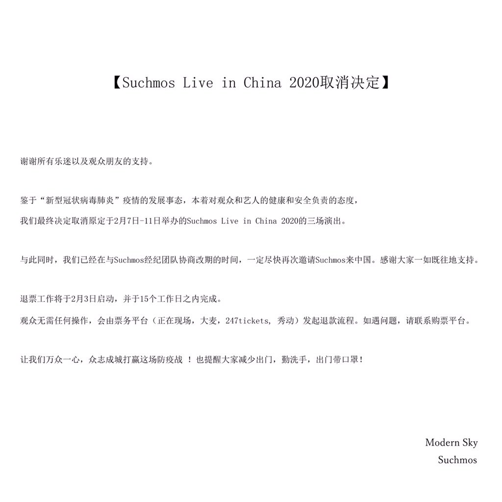 中国公演 中止のお知らせ