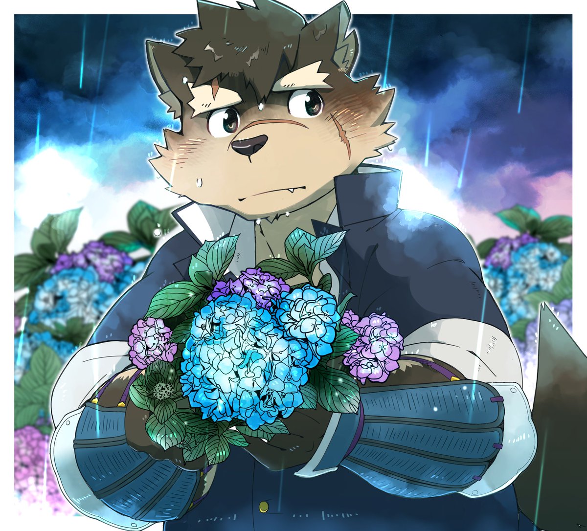 近所の紫陽花がきれいだったので、モリタカくんで梅雨っぽいイラストを……