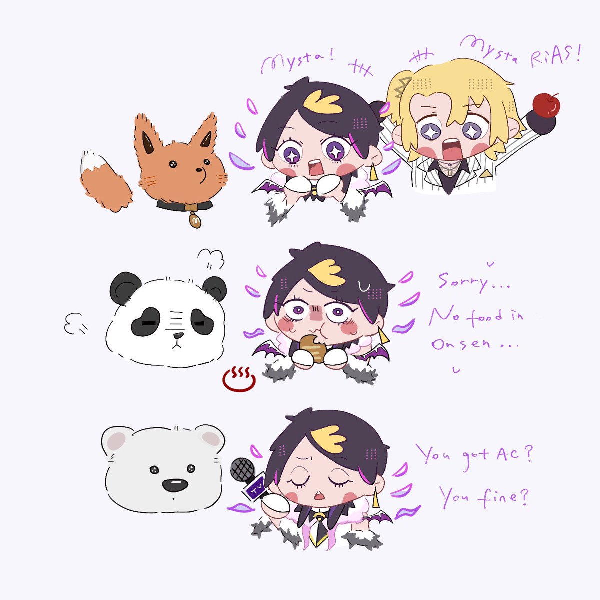 ペトラさんがおにぎり食べてて、ティッシュがない時はシュウさんが僕あるよって言ってウェットティッシュ(?)を渡してた、それで片手でペットボトル開けれない時は、僕が開けるよって言って開けてた