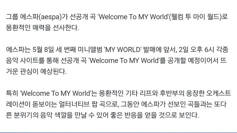 aespa plans to release pre-release single 'Welcome To MY WORLD' on music sites on May 2nd, 6PM KST. The 'MY WORLD' INTRO clip with a dreamy new song posted features aespa who has returned to the REAL WORLD.
