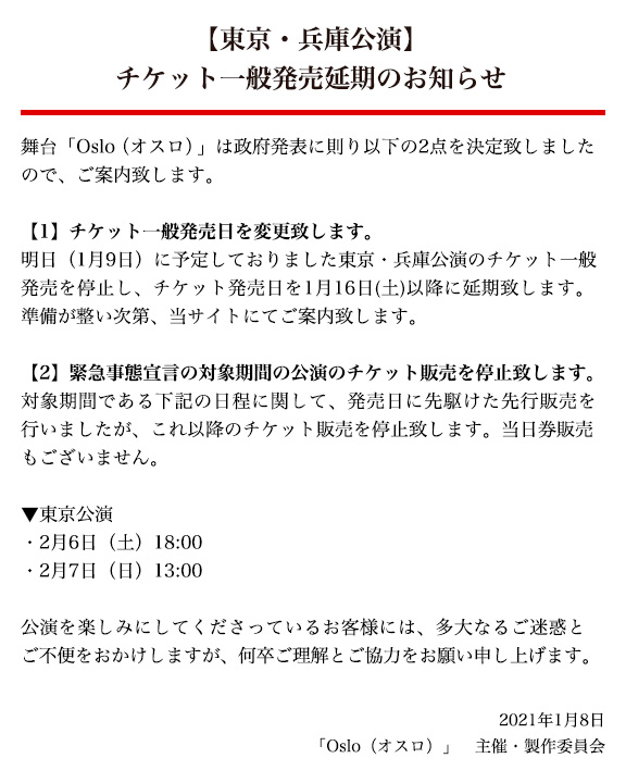 3/22(月)~4/21(水)の期間限定で、「Oslo(オスロ)」公演パンフレットの通信販売が決定しました!