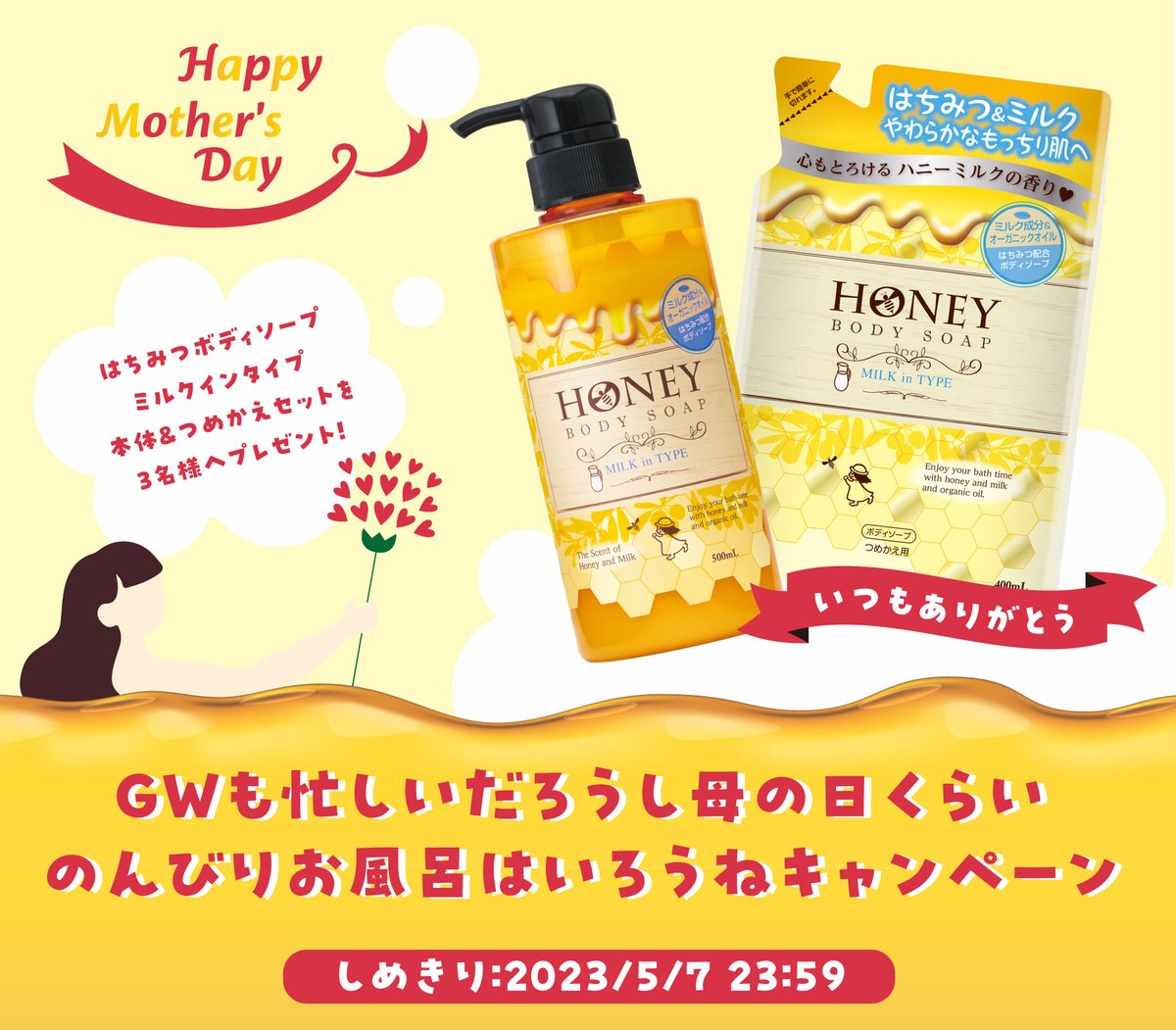 はちみつボディソープミルクインタイプのセットを3名様にプレゼント🍯毎日忙しいおかあさんが時間を気にせずゆったりのんびりお風呂にはいれますように🛀🫧#懸賞