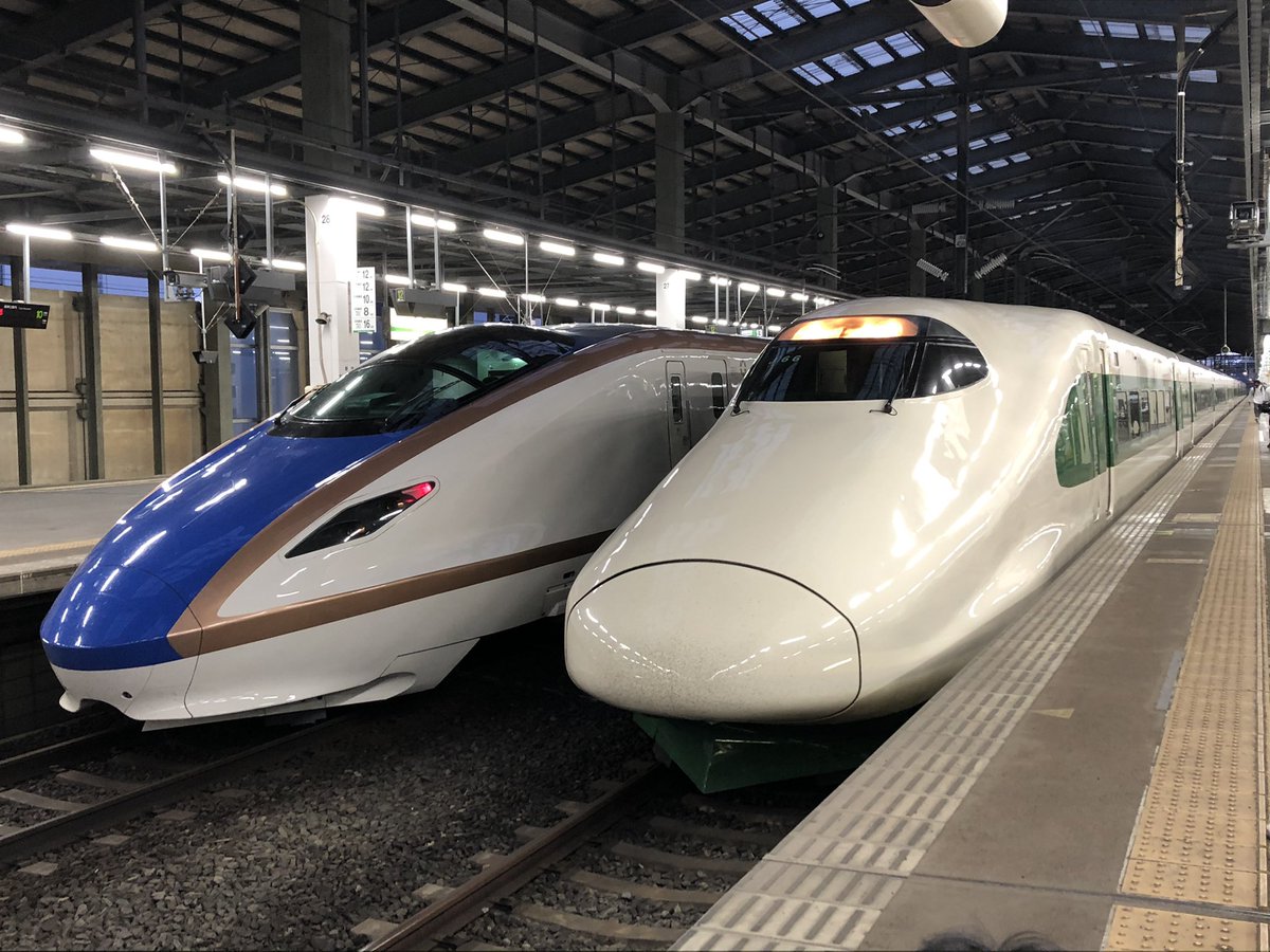 新潟駅での200系カラーのE2系とE7系の並び。