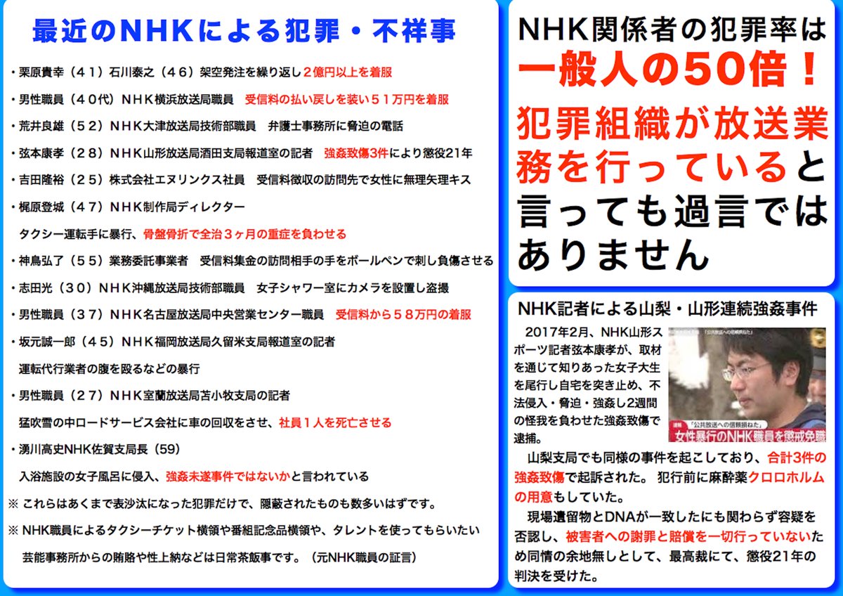 NHK関係者が犯罪係数が高い理由は、そもそもが集金人の居座り強要脅迫詐欺で成立している犯罪組織だからです。