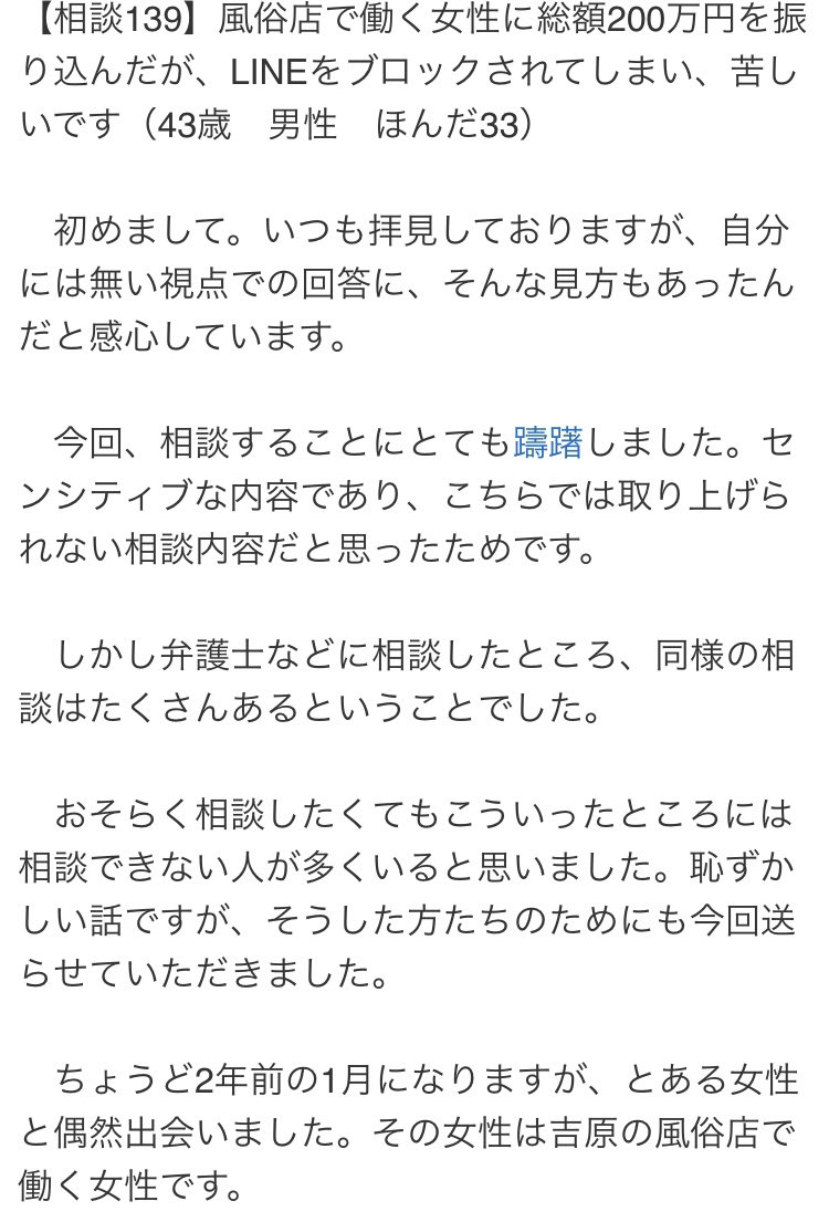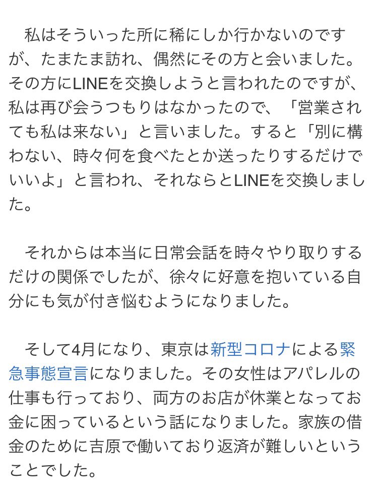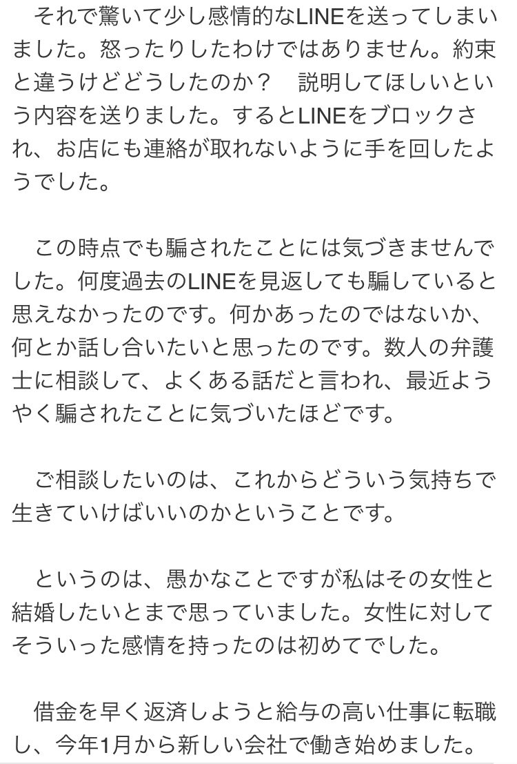 特性持ちかな?と思って気を遣って接客してたら、プレイ途中で座ってお話ししましょうと言い出しテーブルの上に障害者手帳・医者が書いた意見書2通・自分の母親の死亡届のコピーなどを順番に並べて、虚構の世界の話を始めた時が一番怖かった。