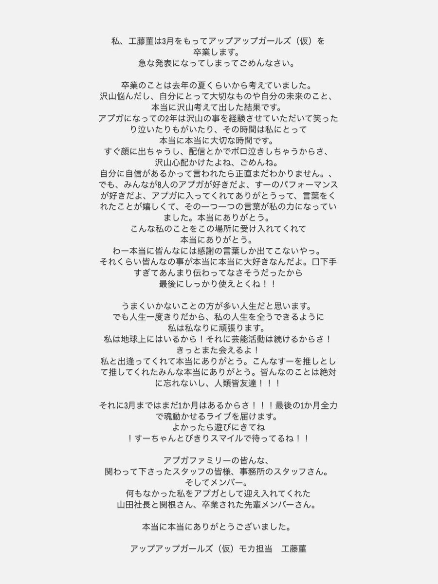 私、工藤菫は3月末をもってアップアップガールズ(仮)を卒業します。急な発表になってしまいごめんなさい。