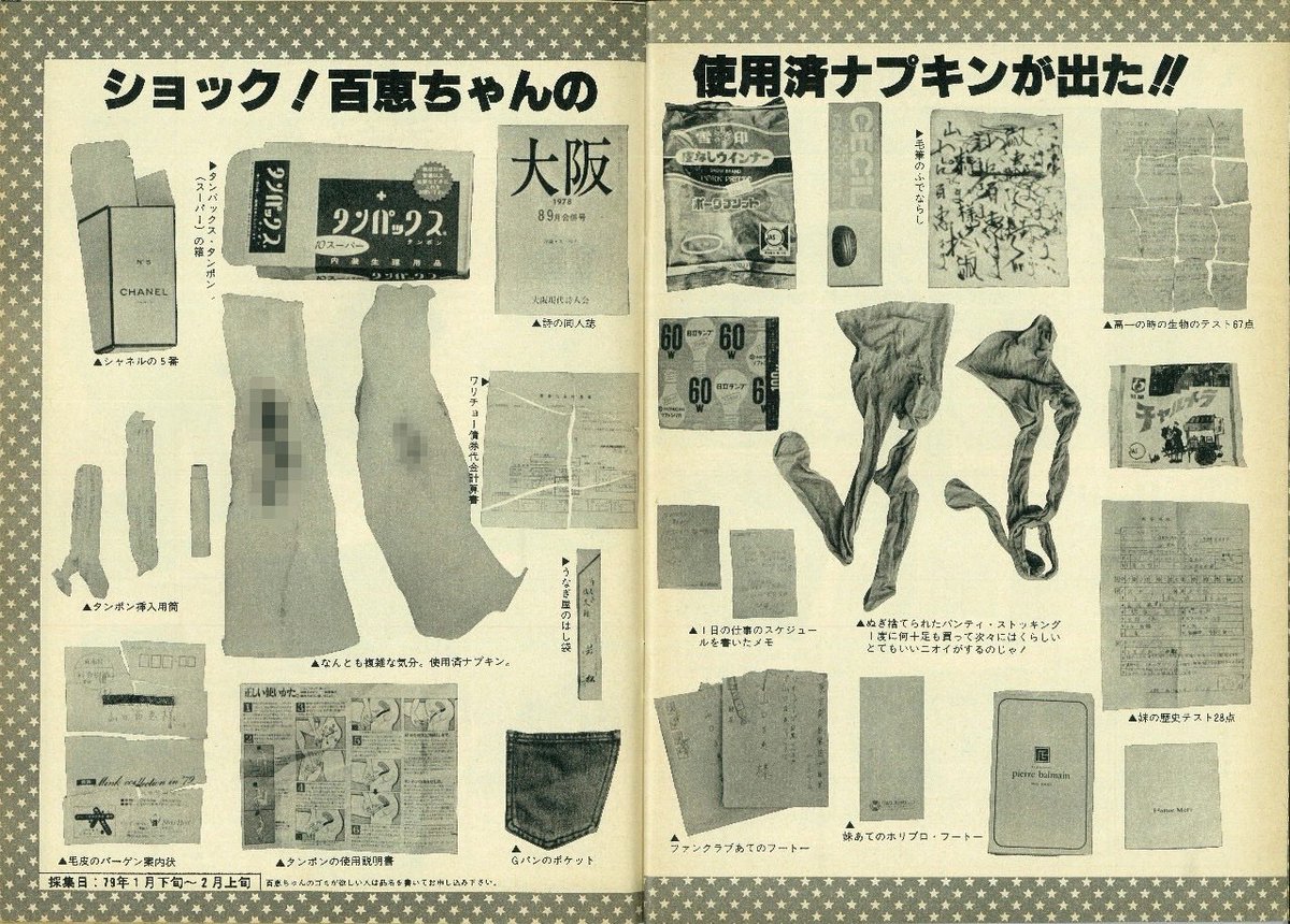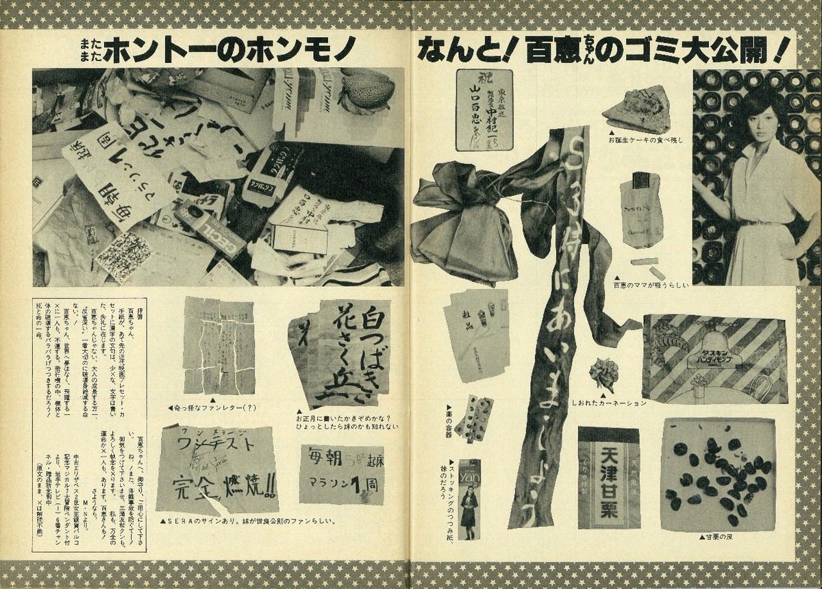 昭和の雑誌がキツすぎる… 百恵ちゃんのゴミ大公開ってよく企画として通ったね( ꒪⌓︎꒪) ナプキンとかはさすがにNG。