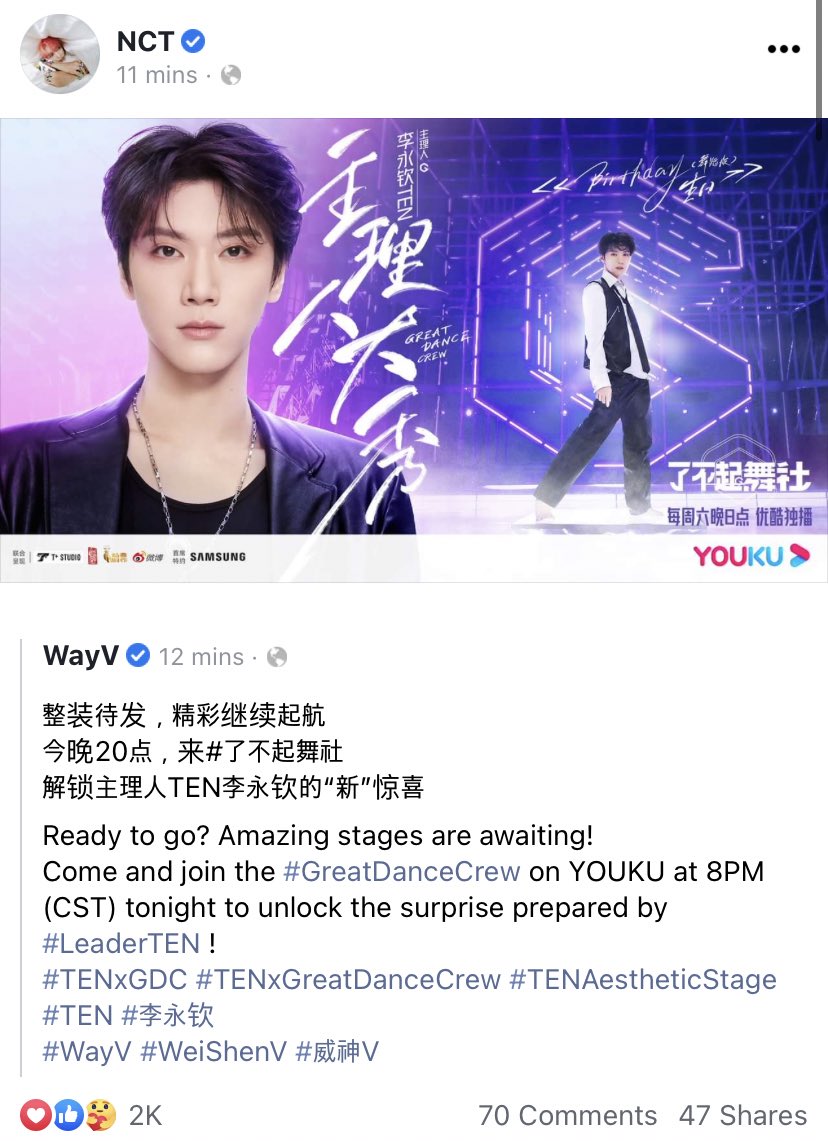 NCT’s official Facebook account also reposted @WayV_official #TENxGreatDanceCrew. Go like, comment and share if you can!