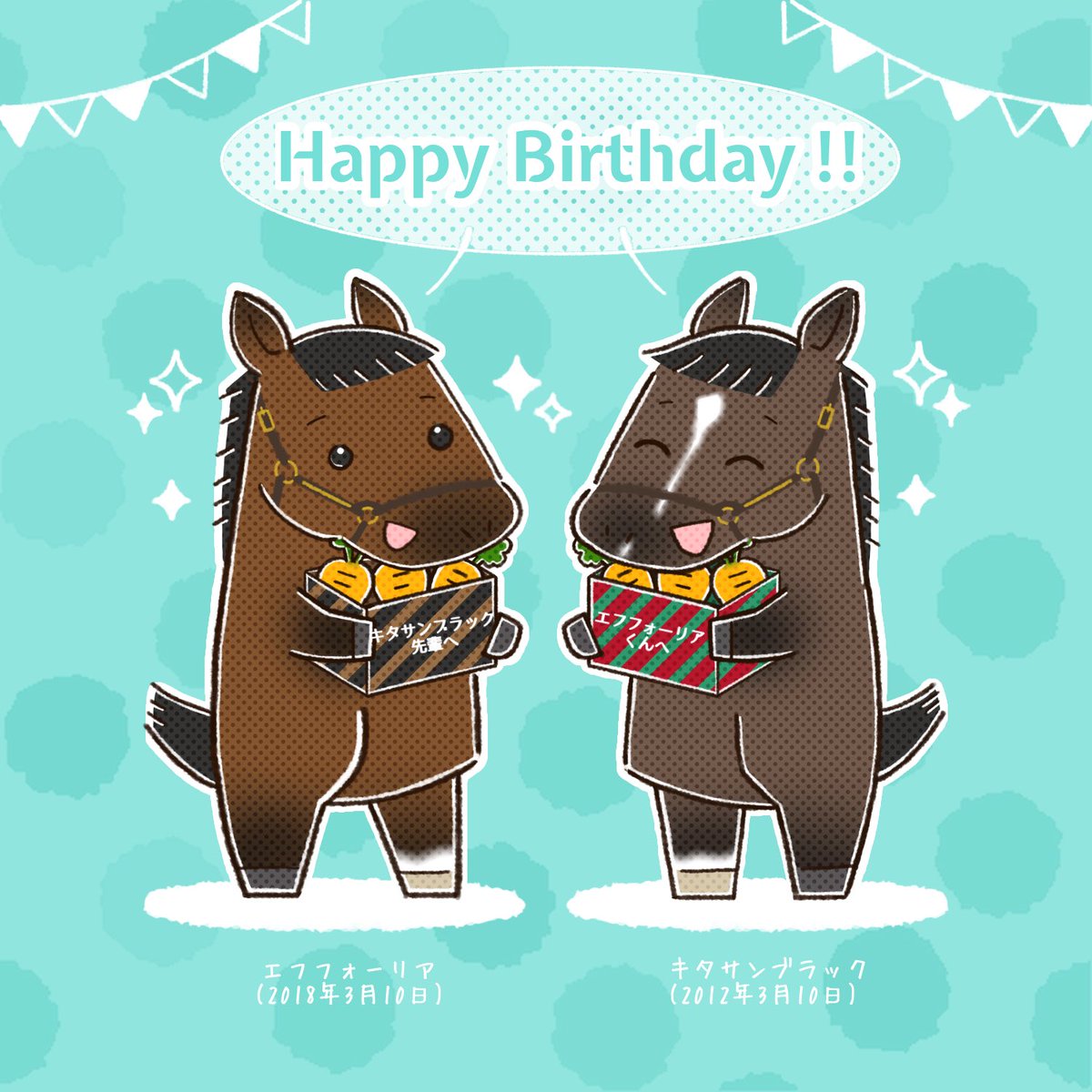 スタリオンではお隣の馬房という噂を聞いたので仲良くお誕生日会していて欲しい🎂✨ エフフォーリアくんキタサンブラック先輩お誕生日おめでとうございます🎉✨