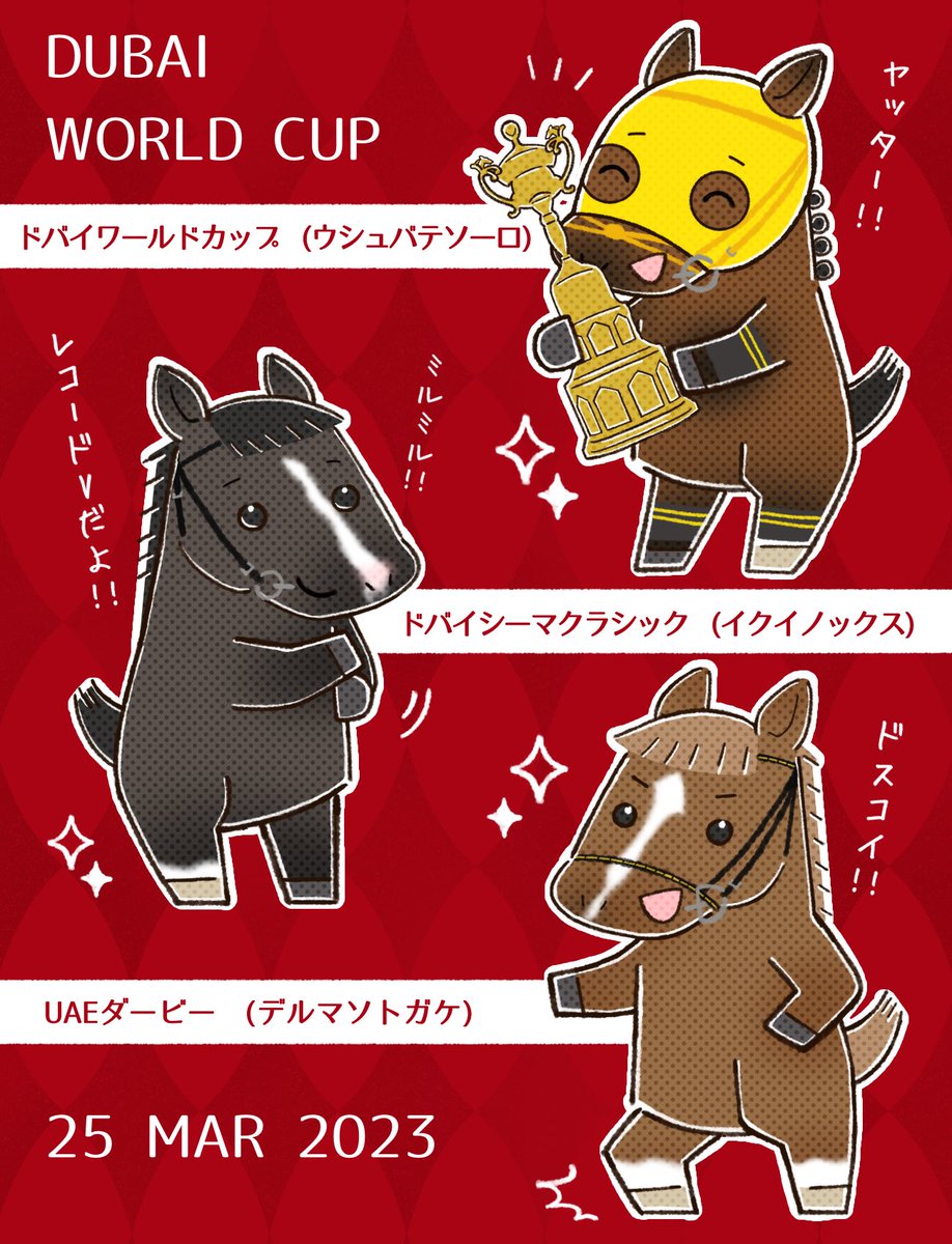 ウシュバテソーロくん、イクイノックスくん、デルマソトガケくん、見事なドバイ制覇おめでとうございます🐎🥇✨ そして惜しくも勝利には届かなかった子もみんな素晴らしいレースを有難うございます。本当に全人馬お疲れ様でした。また日本で活躍される日を楽しみにしています。