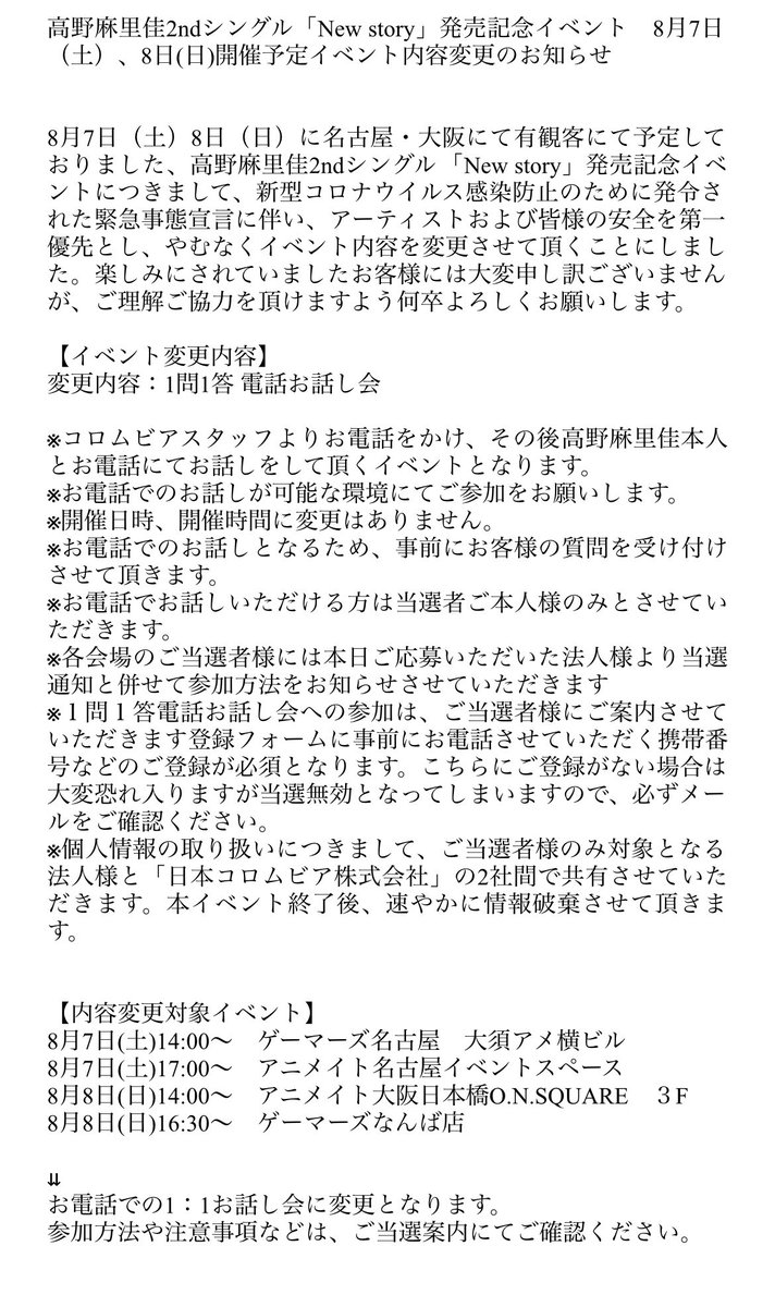 【8/7(土)・8/8(日)開催、「New story」発売記念イベント内容変更のお知らせ】