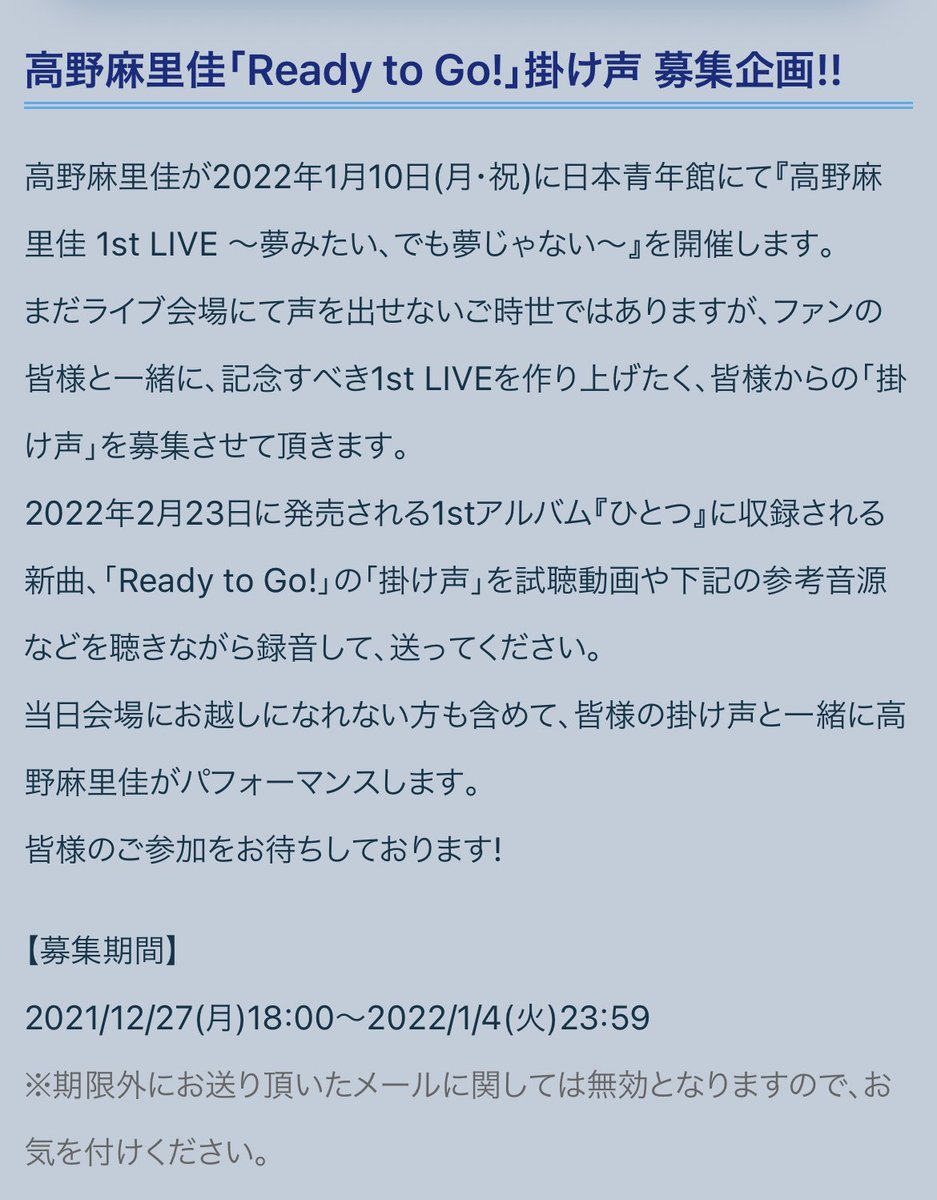 1st アルバム「ひとつ」発売決定 &『高野麻里佳 1st LIVE 〜夢みたい、でも夢じゃない〜』開催決定に関するコメント動画を公開しました!