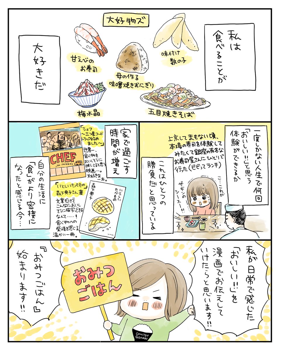「おみつごはん」では、実際作っておいしかったレシピやマイブーム食、大好きなお店や市販のものなどなど私が生活の中で感じた「おいしい〜!」を沢山描いていけたらと思います。よろしくお願いします!