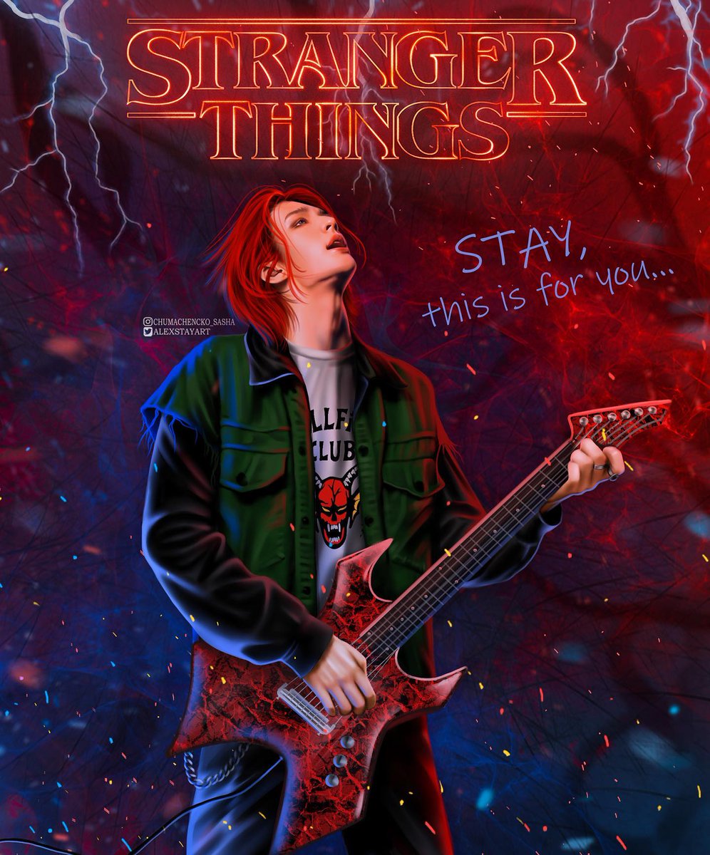 OP hizo este dibujo de Hyunjin como Eddie en la escena donde está tocando la guitarra para Chrissy y escribió "STAY esto es para ti"