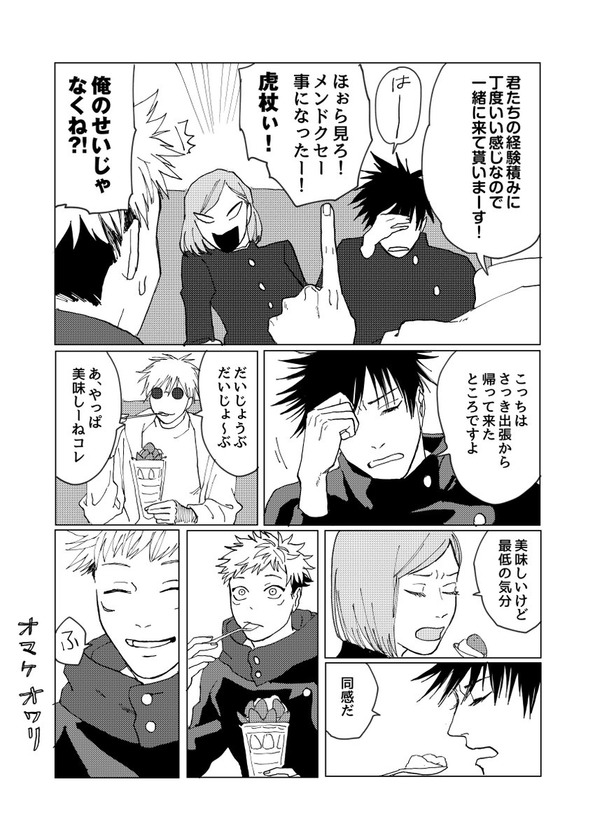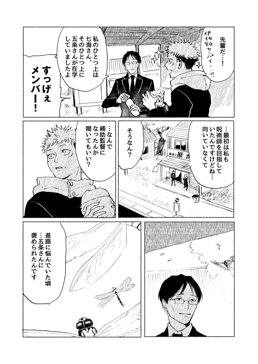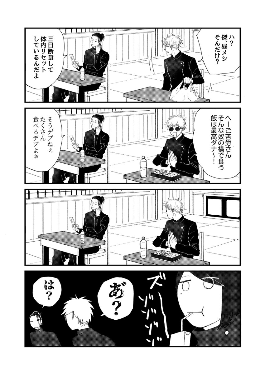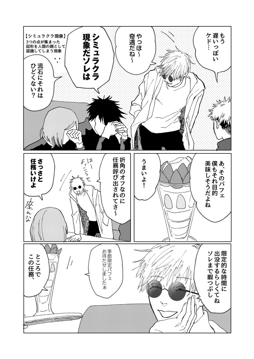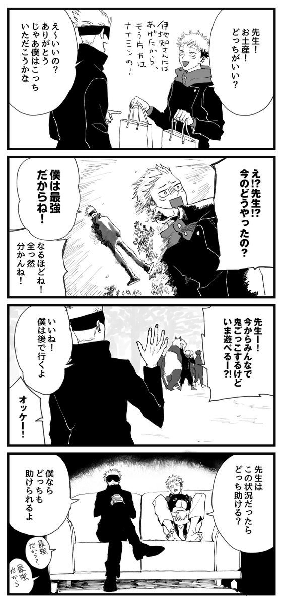 春に授業中窓から流れてくる桜の花びらを先生に見つからず捕まえる遊びを3人でしていたら黒板に数式書き込んでいた五条先生が数式書き込みながら1番に捕まえ、はい、ざんねん僕の勝ち〜授業集中して〜なんて笑うからブーイングが起きて授業がグダグダになり今からいっそ花見行くか!となる午後