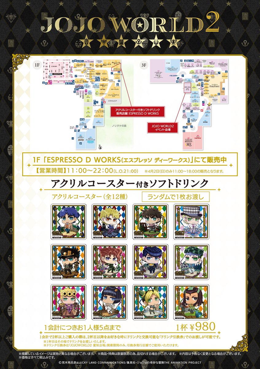 JOJO WORLDアクリルコースター付きドリンク(全12種)発売中ッ!