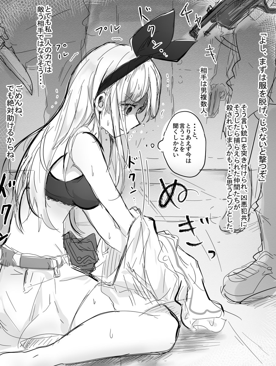 脅された女の子が野郎どもにこの後犯されるか痛めつけられるかどっちかなと想像しながら服をゆっくり脱ぐ絵。