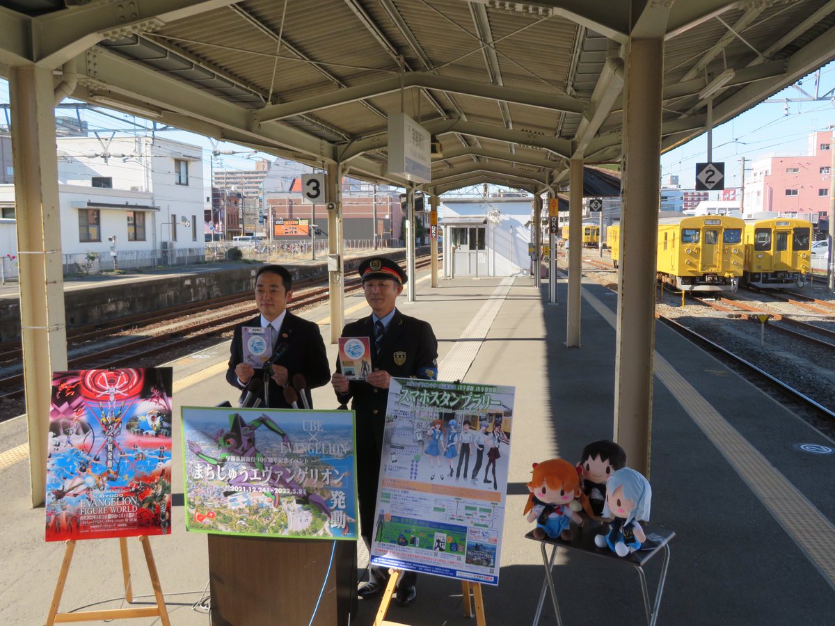 #出張萌えサミットin宇部 が開催され、そのオープニングセレモニー内で本市出身で声優・歌手の #谷山紀章さん へ #宇部ふるさと大使 の委嘱状をお渡ししました。その後、JR宇部新川駅の一日駅長にも任命された谷山さんと、電車のお見送りにも参加しました。