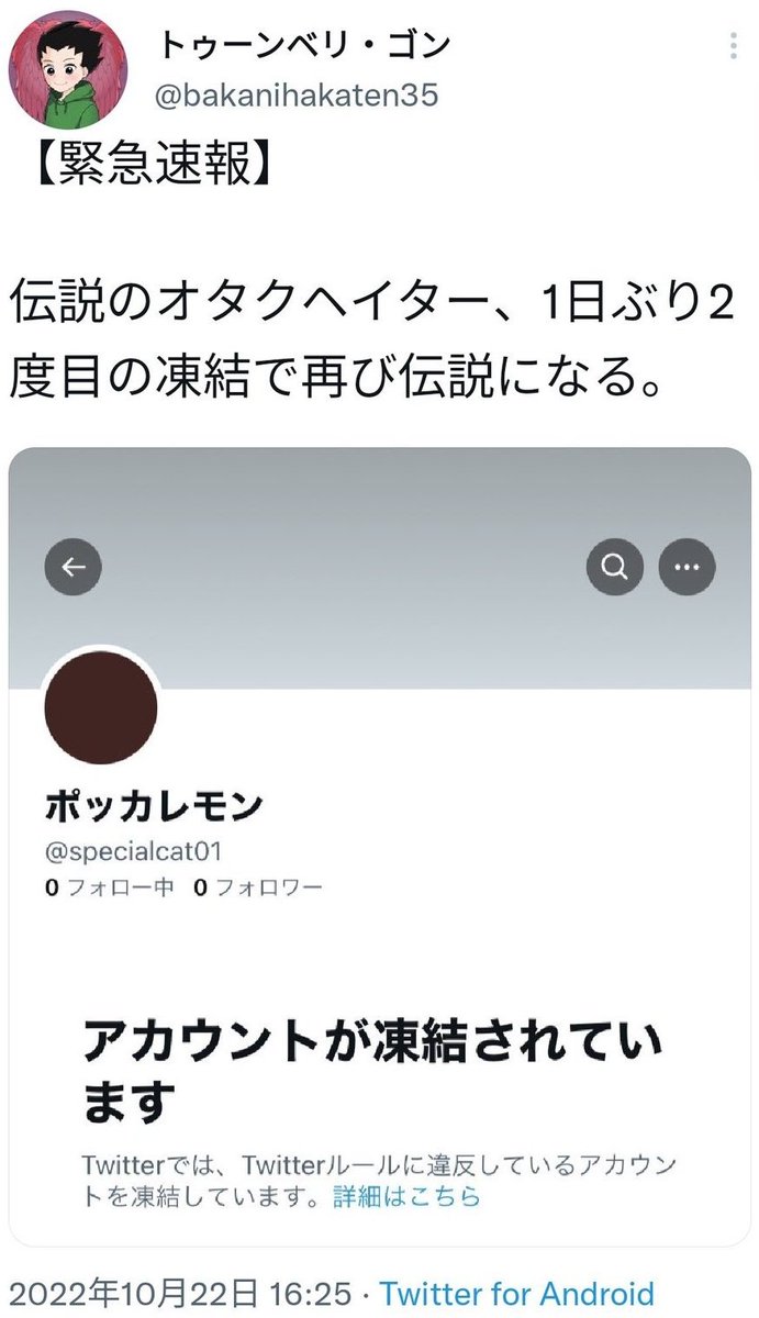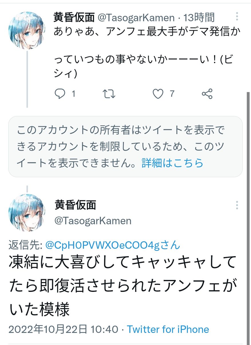 「ポッカレモン(@specialcat01)は即復活した」「アンフェ最大手がデマ発信か」と大喜びしてキャッキャしていた黄昏仮面(@TasogarKamen)さん、ポッカレモンの再凍結により元から無理筋だった擁護が更に無理筋になる