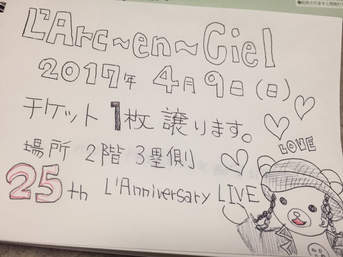 相方が倒れた為1枚お譲りします。 L'Arc~en~Ciel 座席どちらの席でも°˖✧◝(⁰▿⁰)◜✧˖° というドLさんがいらっしゃいましたらご連絡ください。 定価+発券手数料もあるので 12000になります🌈
