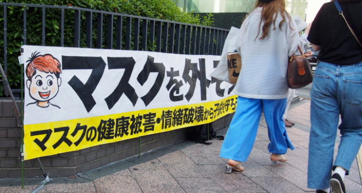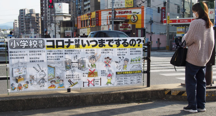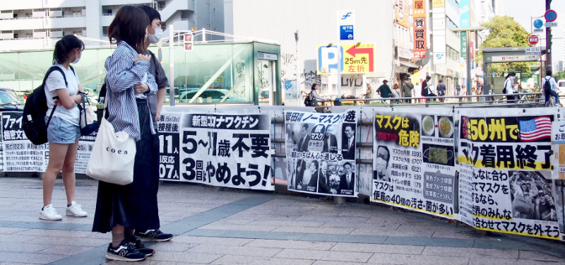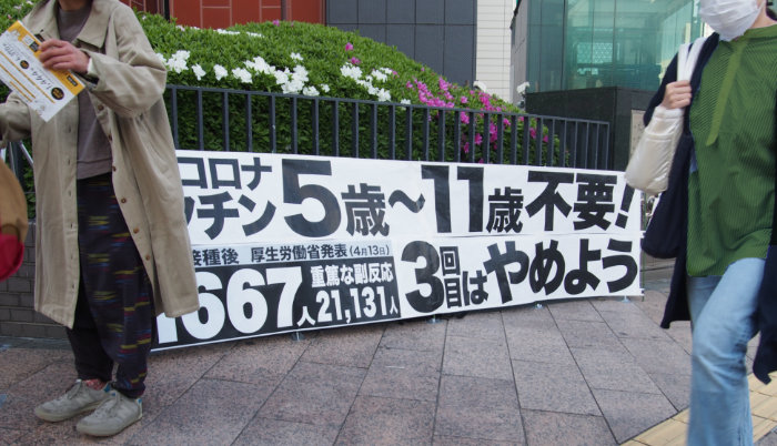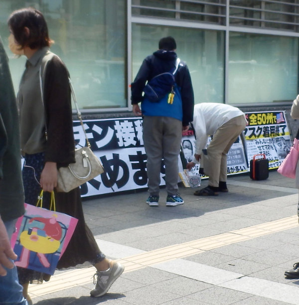 (1)本日夕刻も2カ月ぶりの駅前で4人で宣伝し、小学生から大人までチラシの受け取りも良く、人々の意識が大きく変わり始めていることを実感しました。パネルを設営している時から「私もずっとノーマスクです。何が始まるんですか?」と目を輝かせて近づいてきた若いお母さん、↓(2)へ
