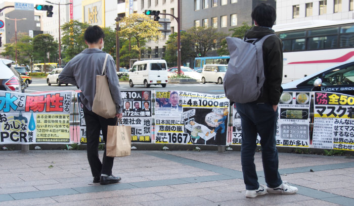 (1)本日は天神で、初参加や見学、途中参加の方も入れて9人で宣伝しました。チラシも100セット近く配布でき、参加者同士の情報交換や交流も深めることができました。出だしから、3人の若者が「俺はワクチン打ってねぇぞ!」と賛同の意思を表してくれました。また↓(2)へ