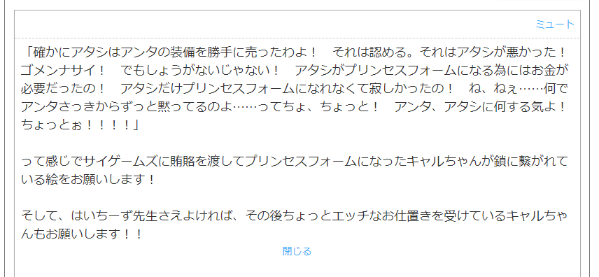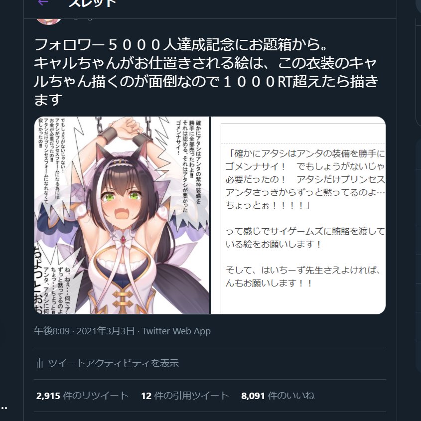 フォロワー5000人達成記念にお題箱から。 キャルちゃんがお仕置きされる絵は、この衣装のキャルちゃん描くのが面倒なので1000RT超えたら描きます