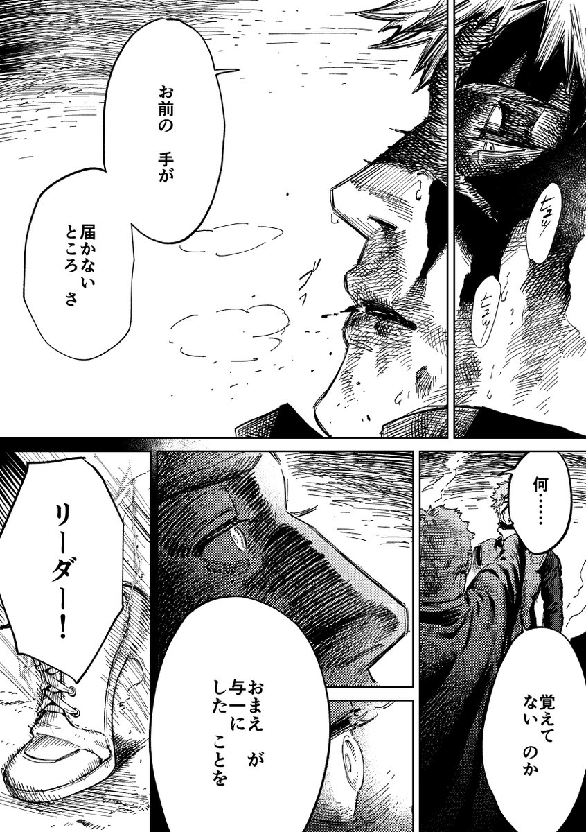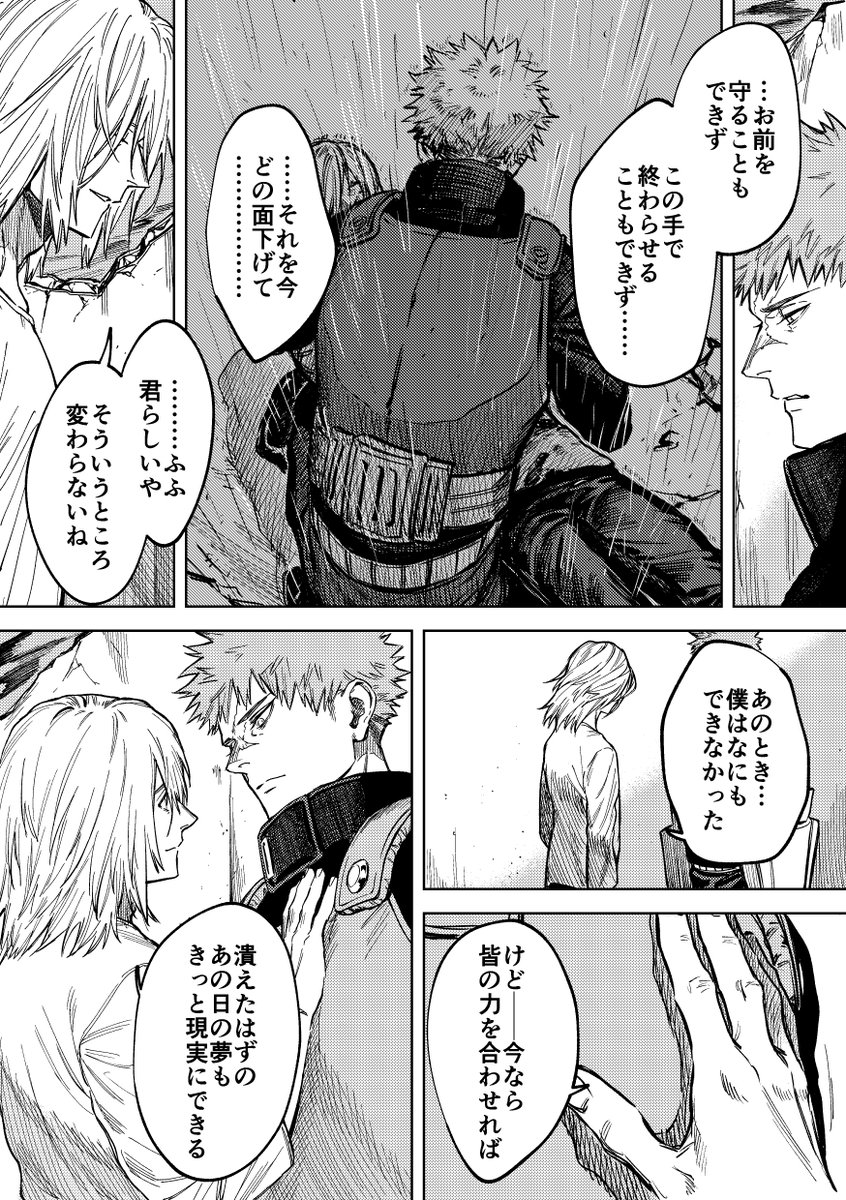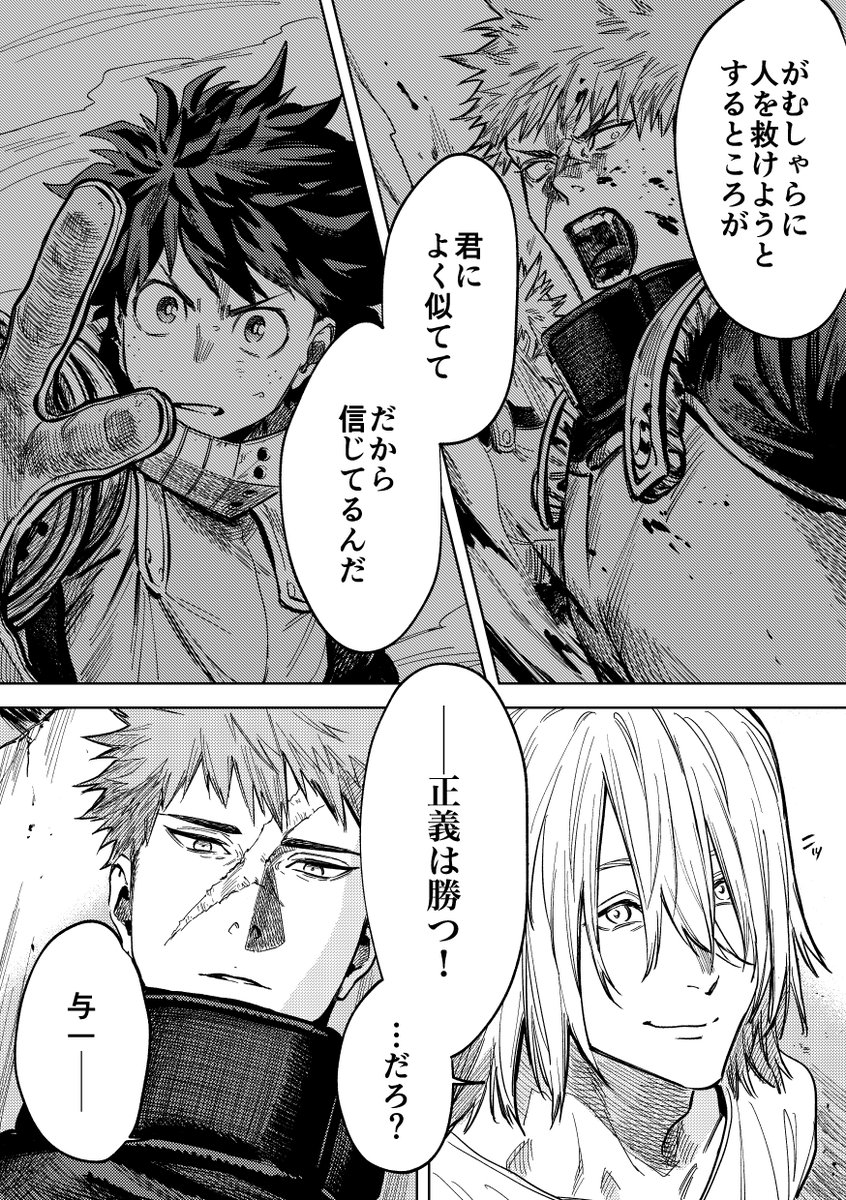 かっちゃん、出久に答えも許しも求めてなくて、ましてや償えるとも思ってなくて、あくまで出久に謝ったことは一つのケジメでしかないと思うから、やっぱり消えない過去は彼の中でずっと背負い続けていく覚悟は決めたんだと思う その上で隣に立つことを選んだんだよな 『理想を超える』ために