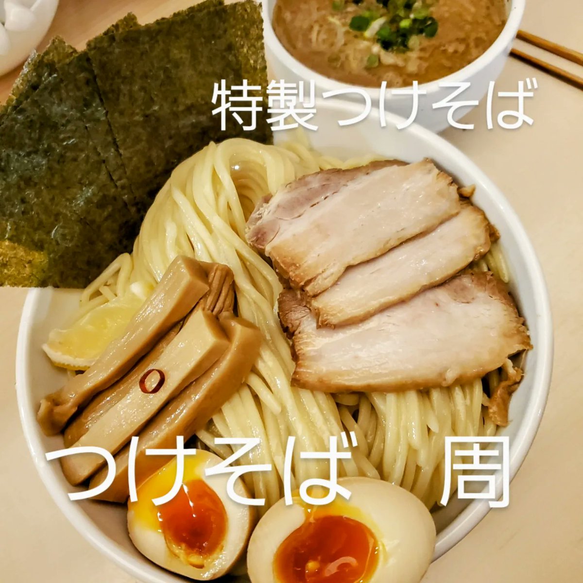 【つけそば周】 特製つけそば大 4年ぶり~🤣 営業中でも店長が店内入り口横にある製麺所で麺をうっております この麺ももっちもちでうまい🍴😆✨ 相変わらずお通し?単品もやしが最初にでてきます🤣 シャキシャキでうまい🍴😆✨ つけ汁はマタオマ系 味変に🍋 うん✨ 当時と変わらずうまかった💯