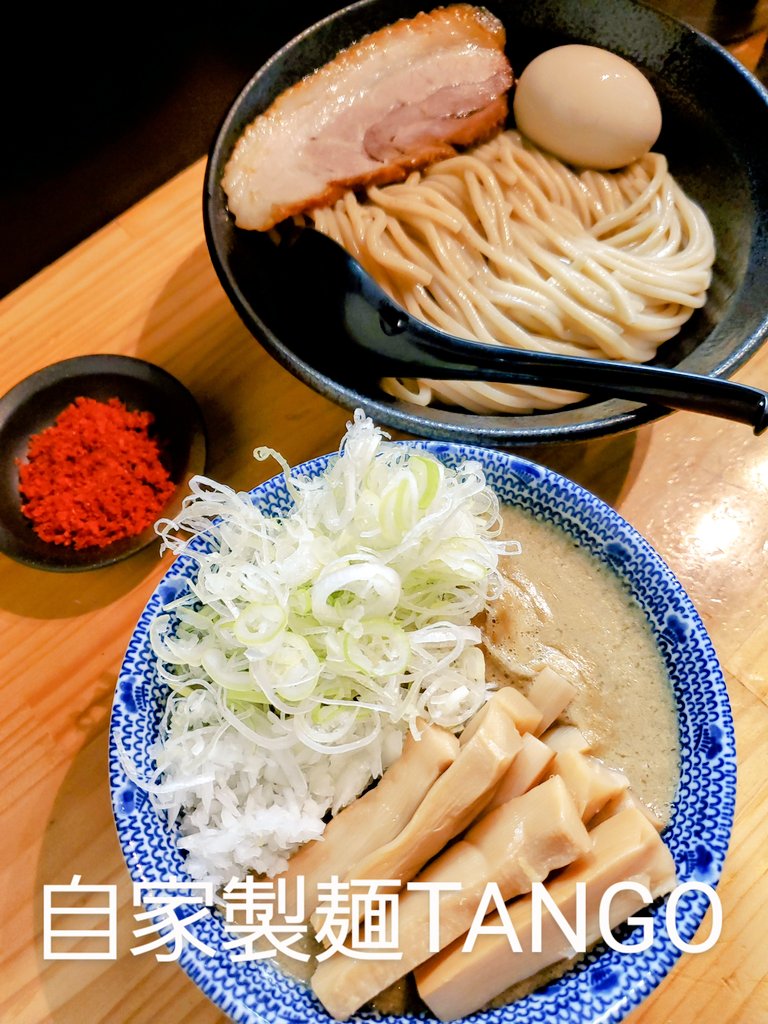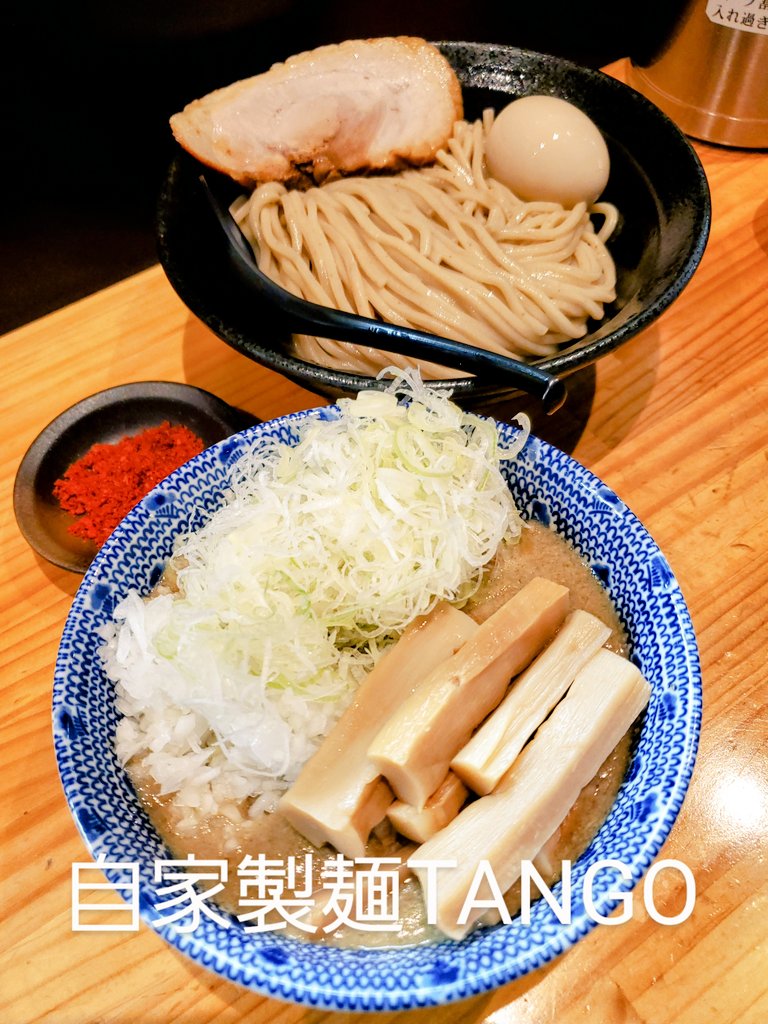 【自家製麺TANGO】 つけ麺中+味玉+ねぎ+玉ねぎ+メンマゴロゴロチャーシュー+辛いやつ +和え玉(鶏油塩) 先週SUSURUTV.に出ておられたので これは並びヤバいやつ🏃‍♂️💦 何とかPP😅 おっ💡 ゴロゴロチャーシュー😆💕 🐓主体の濃厚スープ美味いわ✨ このドロドロ感~最高っすね🤣 美味ければ全て良し😆💕