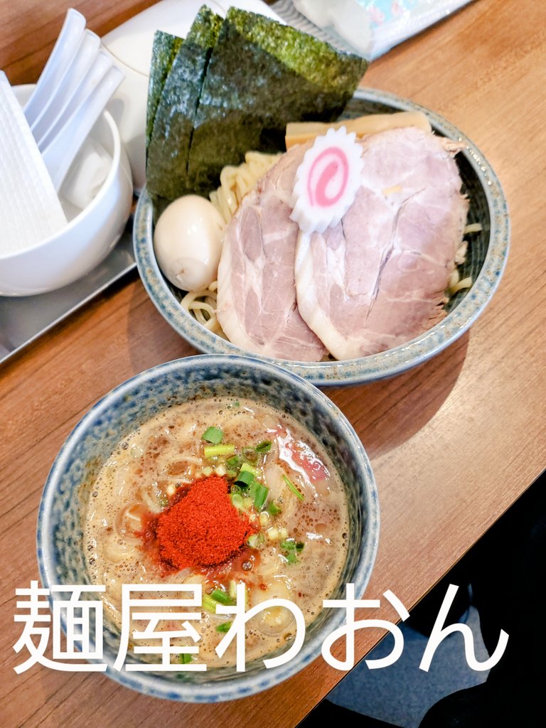 【麺屋わおん】 魚介とんこつ特製辛つけ麺(1.5辛) 久々の🍜活~😂 ここは券売機がなく奥様がご注文を 取り前払いシステム✨ アットホーム的なお店です😌 つけ汁はシャバ系だが動物系と魚介系の濃厚Wスープ サバ節と鰹節が絶妙で 美味いっすね🤣 麺は若干高めのモッチモチ💕 名物BIGチャーシュー👍️👍