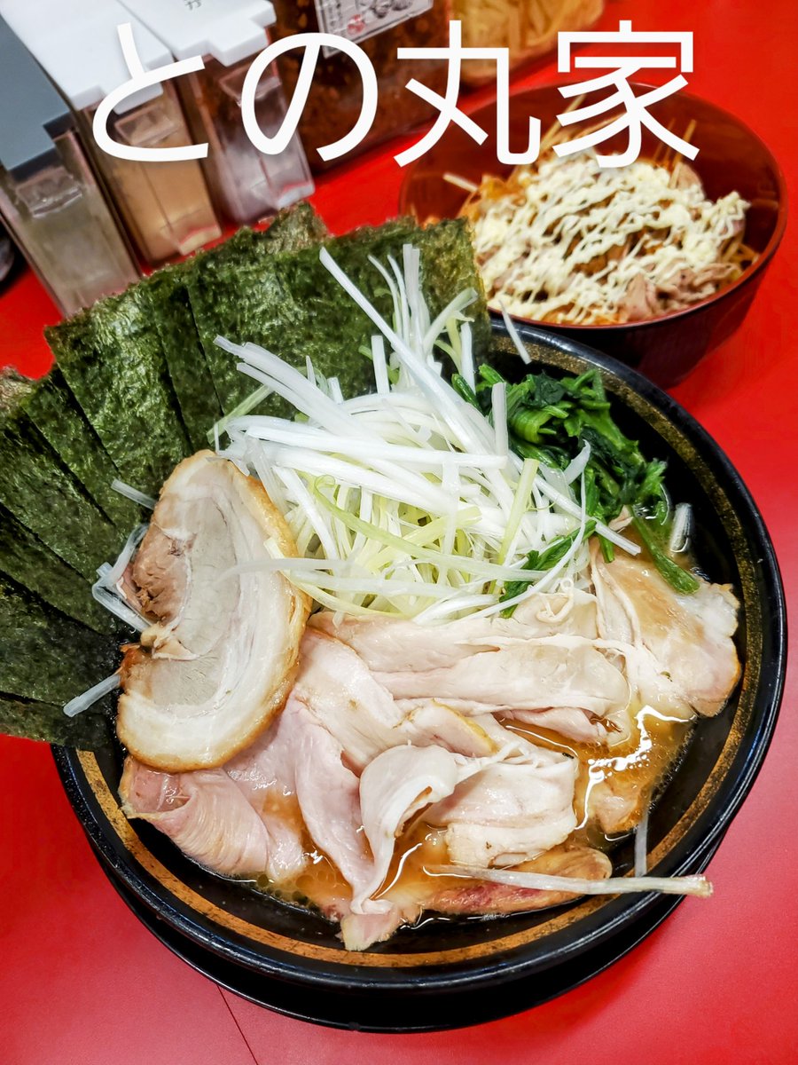【王道家直伝 との丸家八潮店】 チャーシューメン(3枚)+バラ+のり+生ネギ+ネギ丼(赤) 👅酔いの時は家系が食べたくなる💕 濃いスープ😂 あぁぁぁ~ 頭痛いけどもっと濃いもの~🤣 うま~🤣🤣🤣 ネギ丼に無限にんにくたっぷり マヨビーム💕 ☝️最高っすね🤣 👅酔いなのにNiceangleな俺😌 お休み💤