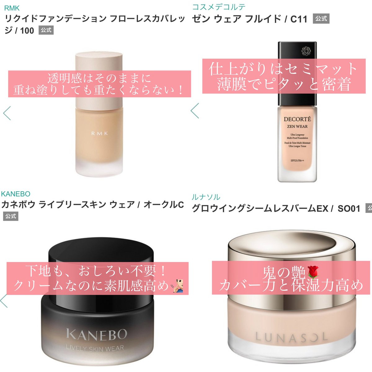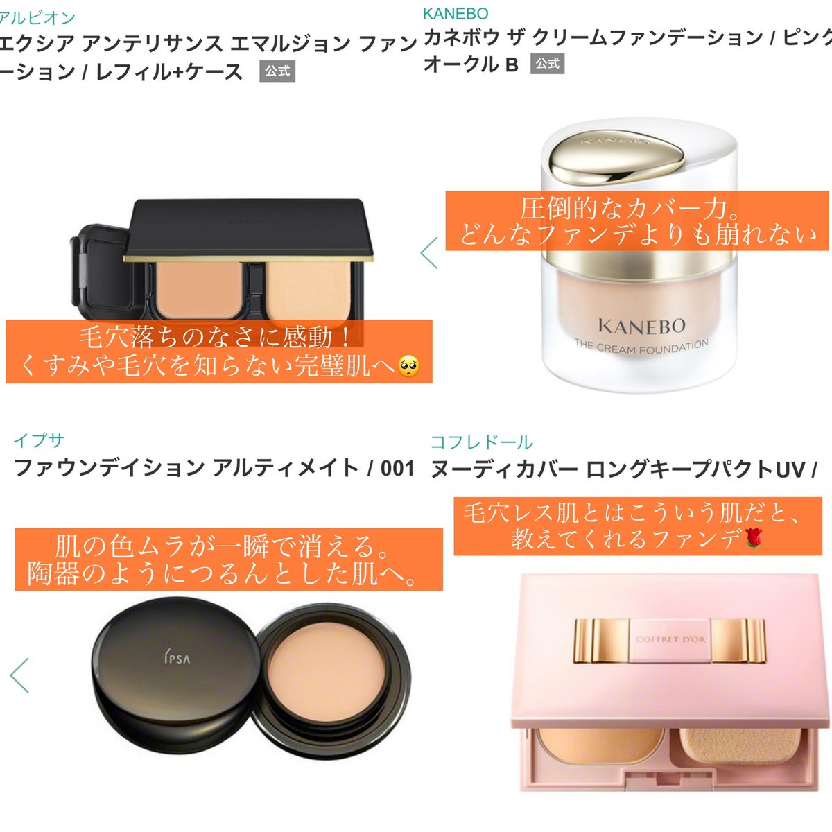 早く出会ってほしいベースとして真っ先に思い浮かべるのがコレ👼✨ クレドは下地の時点で肌が仕上がる。肌綺麗な人はこれだけでも全然良い👰‍♀️ポルジョはむき卵みたいな艶肌でカバー力も高い💁🏻‍♀️ カネボウは夏場でも冬場でも、どんな時期でも一生崩れない…🤦🏻‍♂️デコルテは肌全体が滑らかで透明感のある肌へ✨